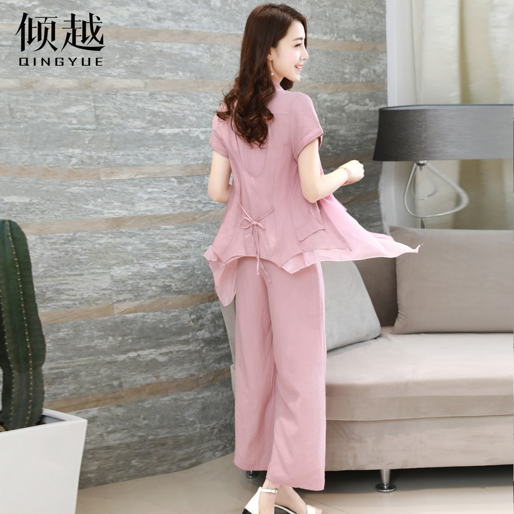 傾越套裝女2017夏裝新款韓版修身短袖雪紡百搭三件套九分褲闊腿褲