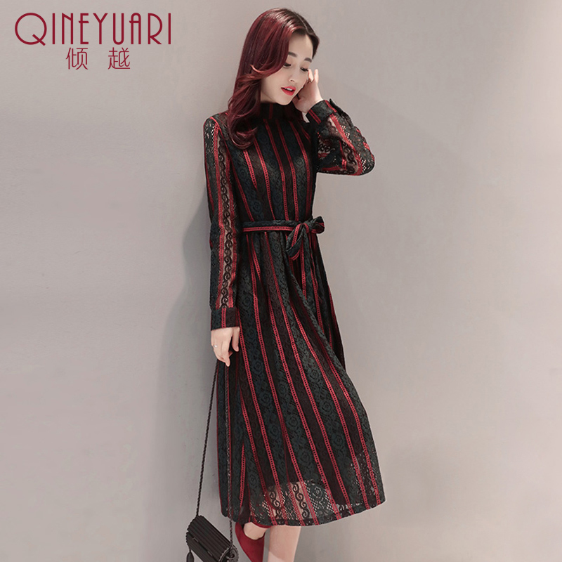 傾越蕾絲鏤空連衣裙2017春季新款韓版女裝長袖系帶豎條紋長款裙子