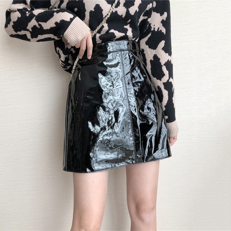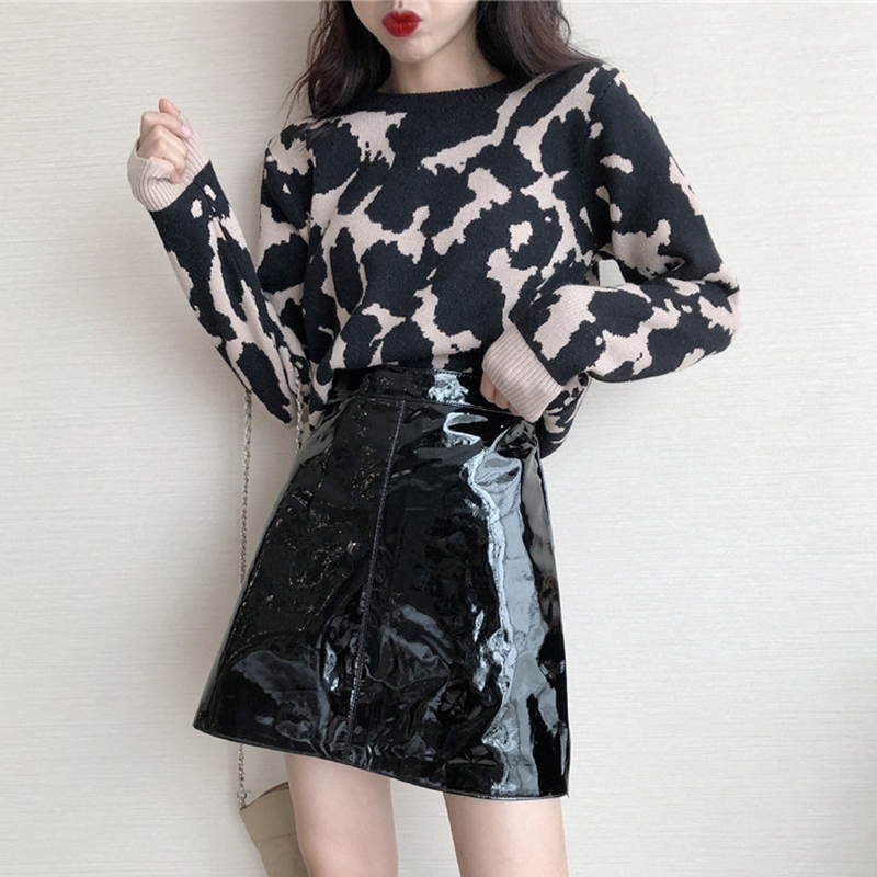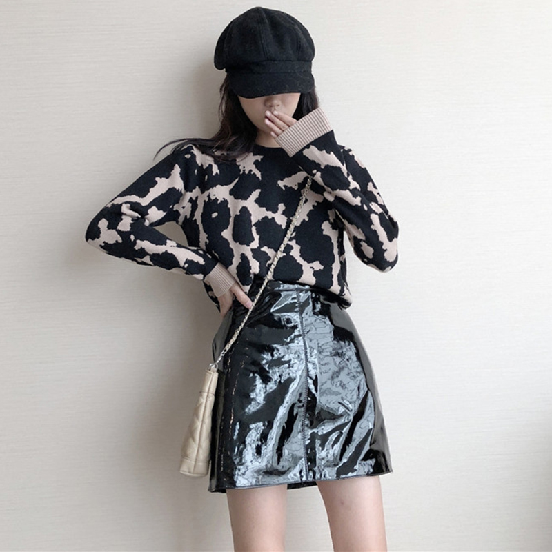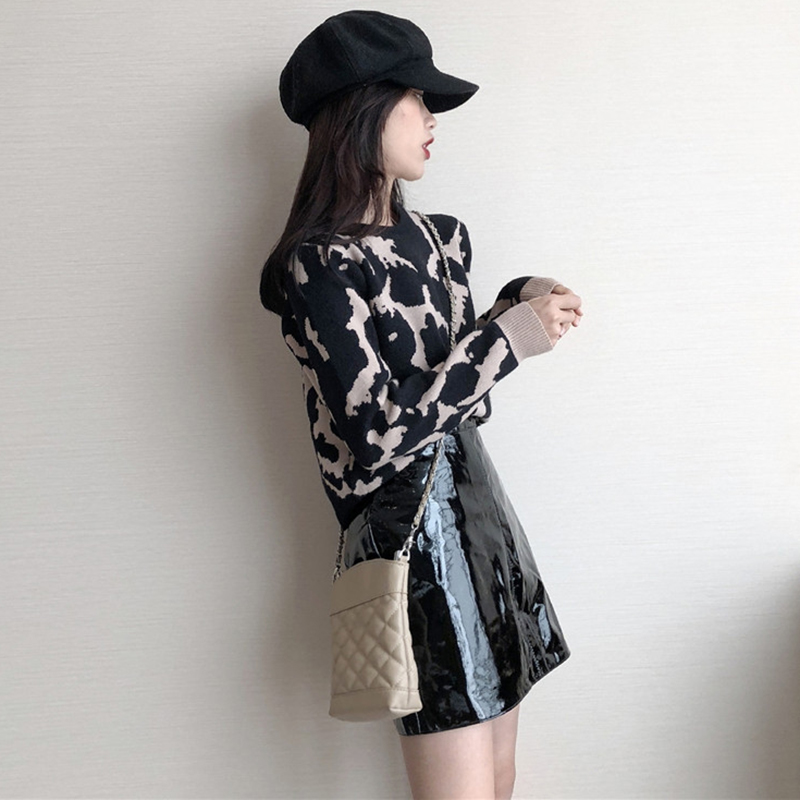 / 御姐套裝女秋冬新款豹紋針織衫毛衣外套高腰顯瘦黑色PU皮半身裙子