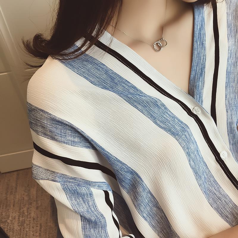 雪紡襯衫女夏韓范寬松短袖學生2017簡約百搭中長款條紋顯瘦上衣潮