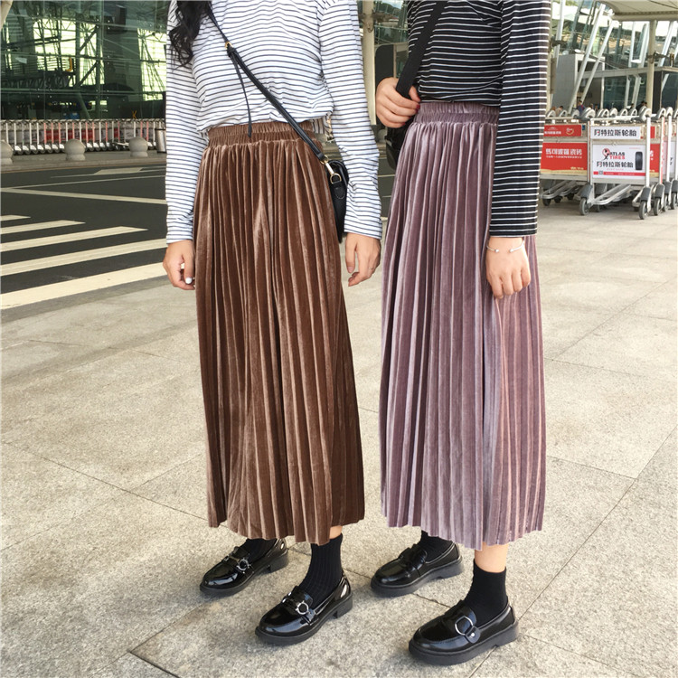/ 秋季女裝韓版復古港味金絲絨百褶裙半身裙高腰A字裙長裙學生裙子