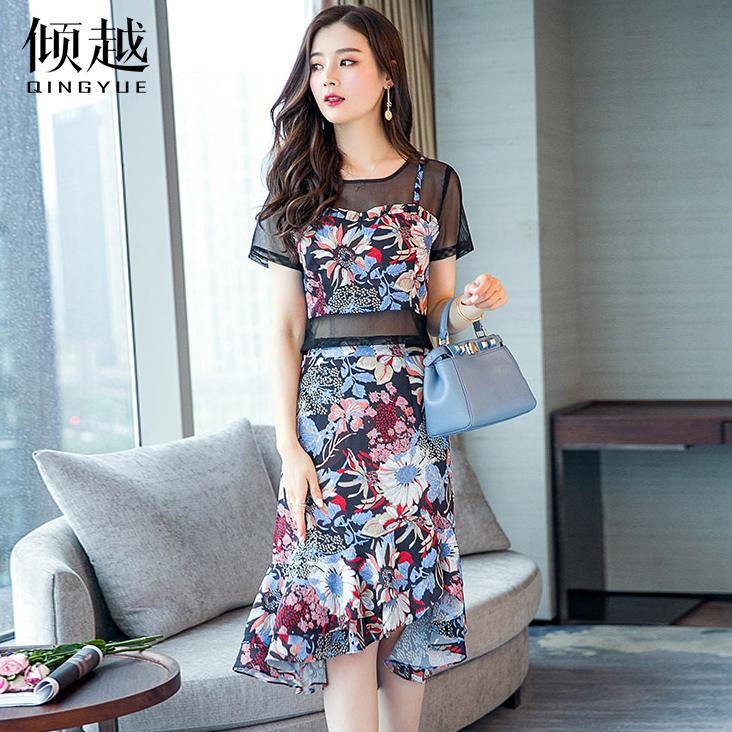 / 套裝裙女2017夏季新款短袖網紗拼接碎花雪紡包臀魚尾半身裙兩件套