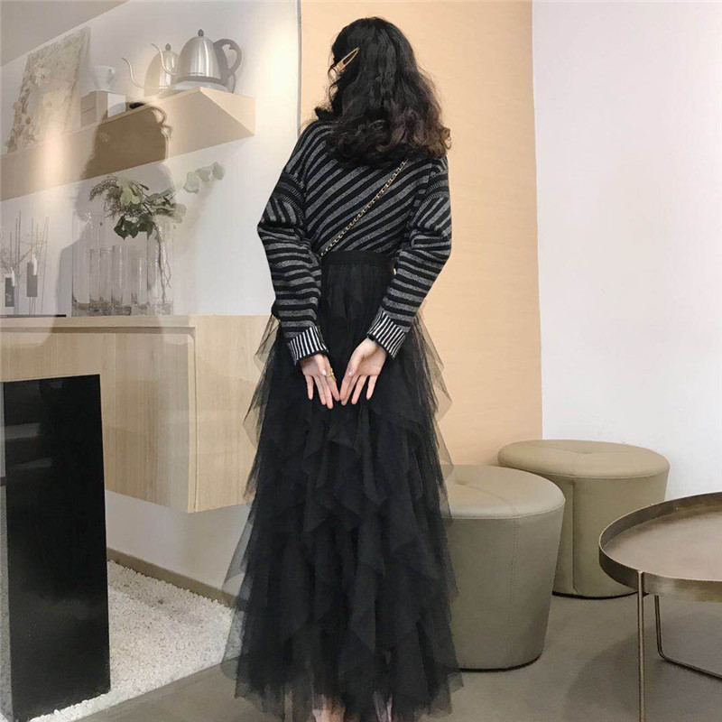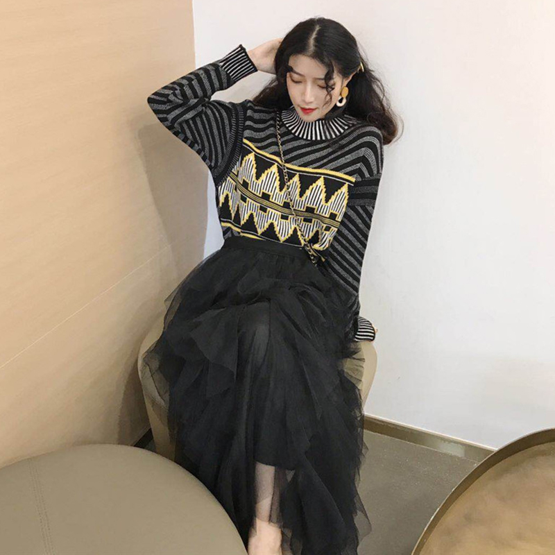 時尚套裝女秋冬新款慵懶風條紋毛衣針織外套高腰網紗A字半身裙子