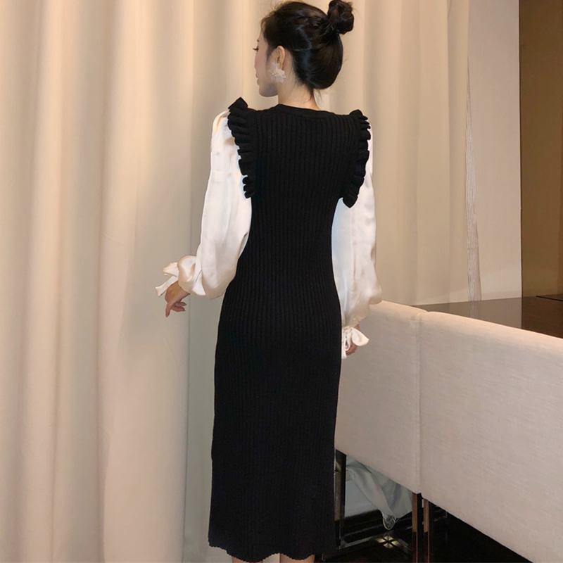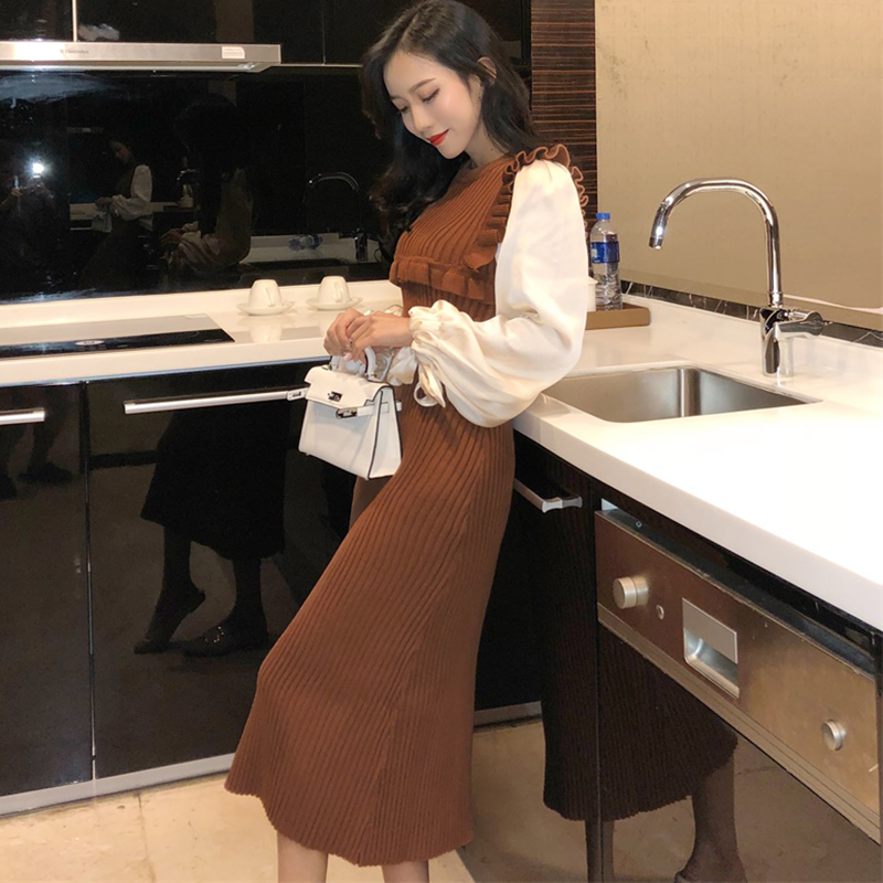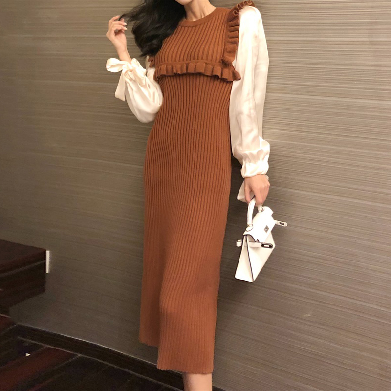 / 學生法式假兩件針織連衣裙子女秋冬裝新款氣質時尚長袖初戀桔梗裙