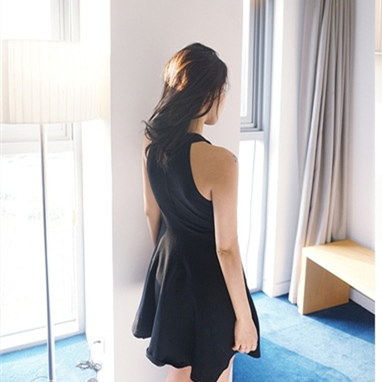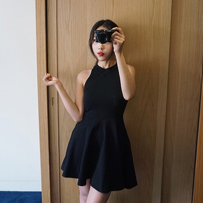 2017夏女裝韓版新款露肩時尚性感小黑裙修身削肩無袖掛脖連衣裙