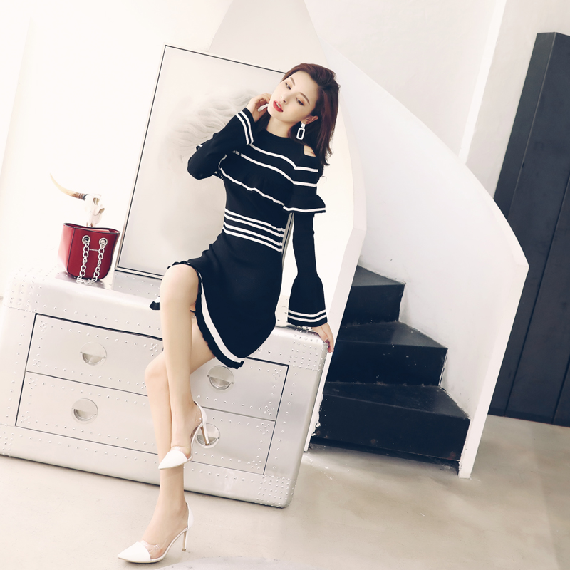 / 名媛氣質露肩長袖針織連衣裙早秋女裝2018新款中長款冬季打底裙子