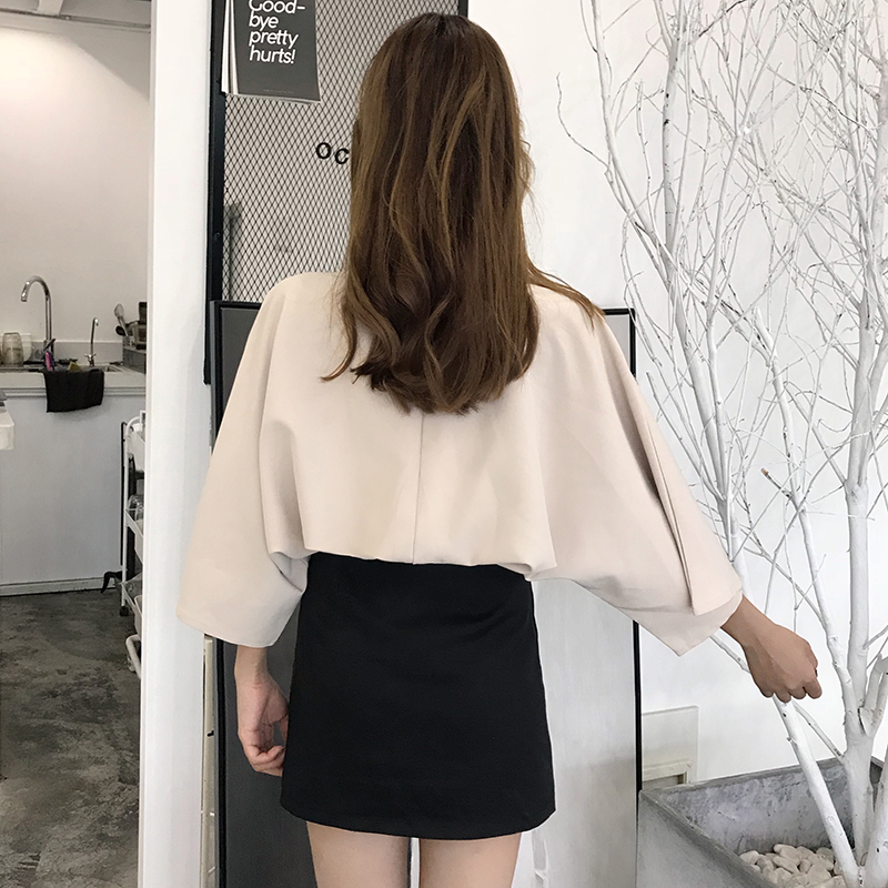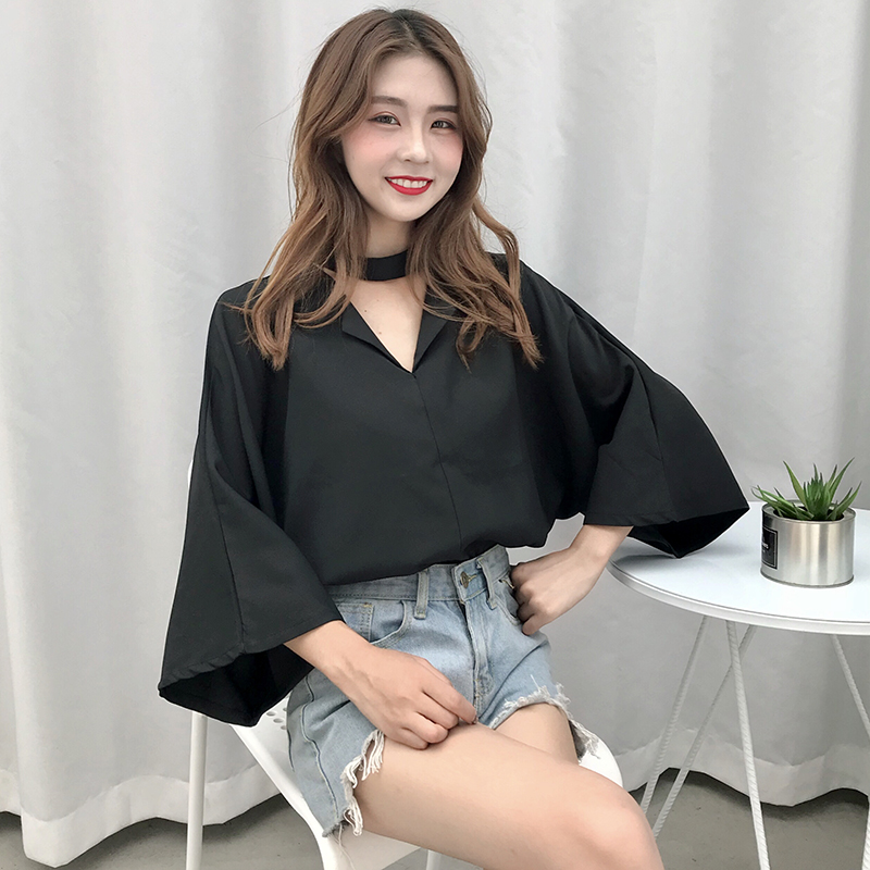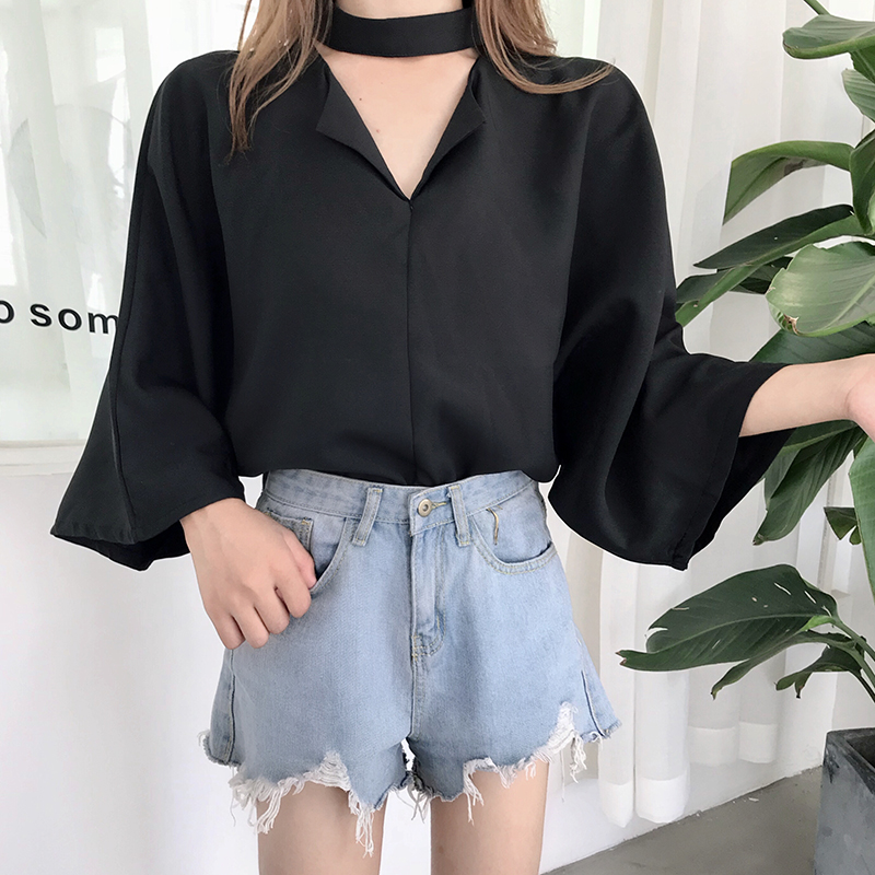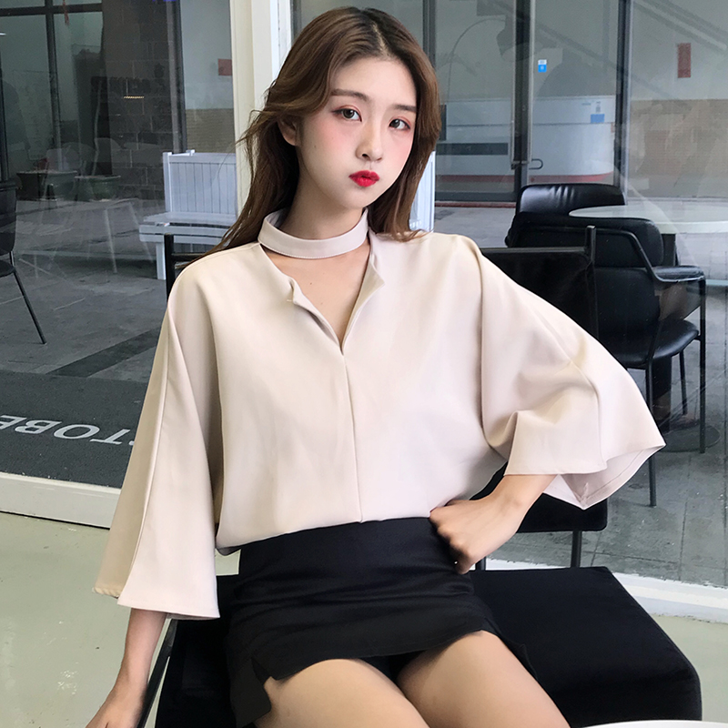 / 新款夏季女裝韓版小心機掛脖V領寬松上衣休閑百搭純色七分袖襯衫