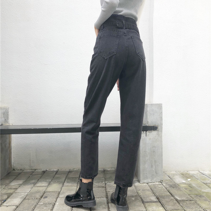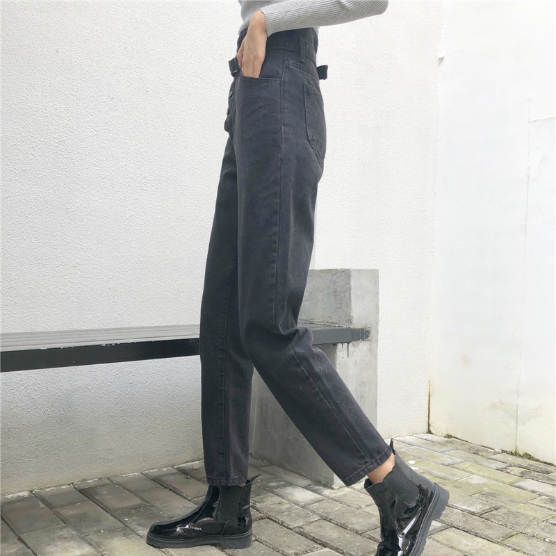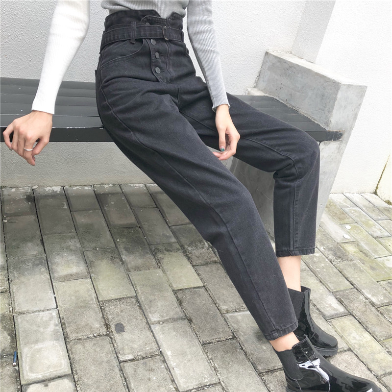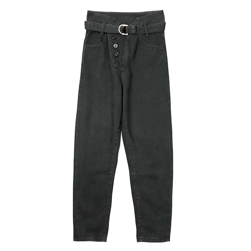 港味牛仔褲女韓版高腰顯瘦不規則排扣哈倫褲秋裝新款黑色九分褲子