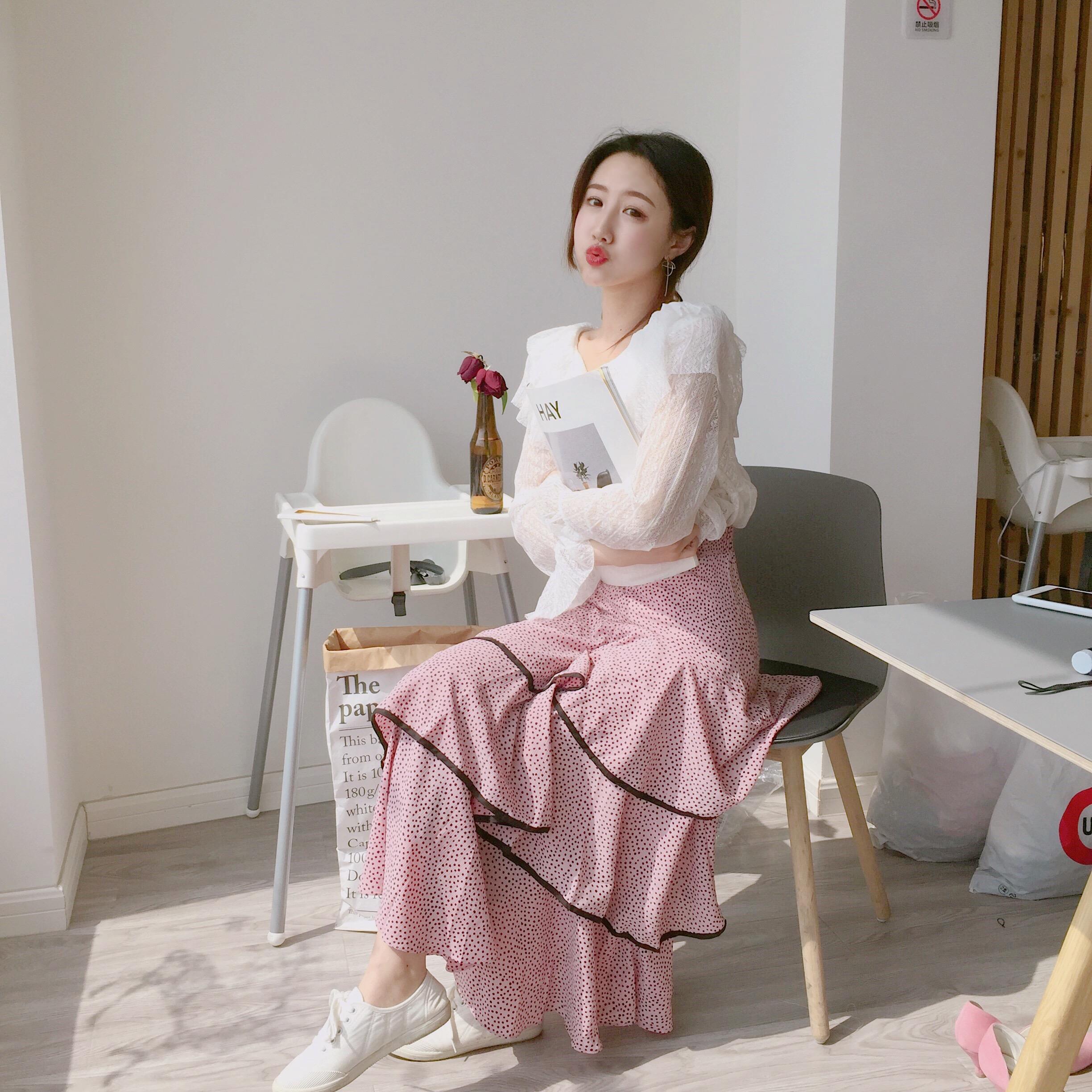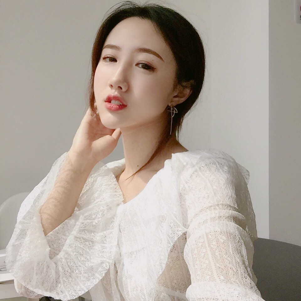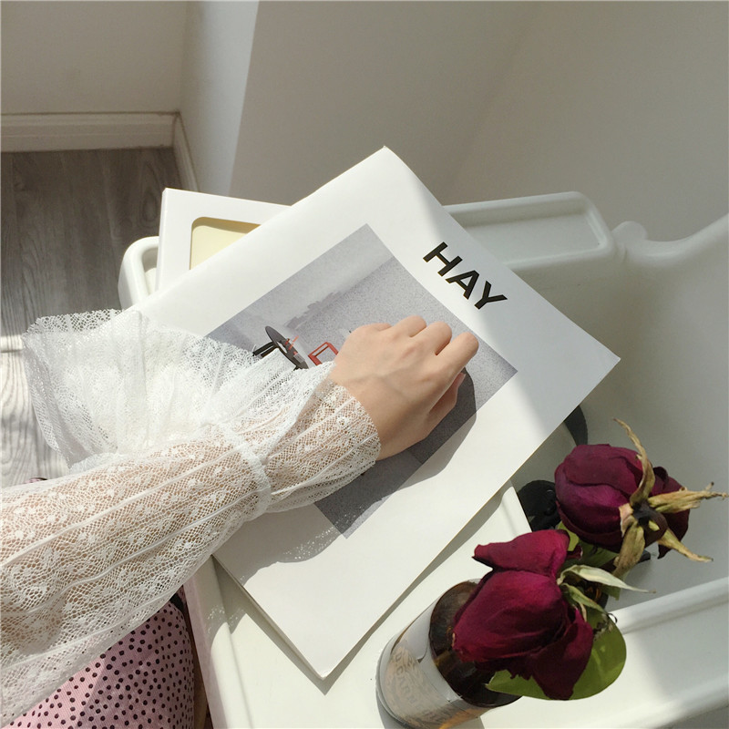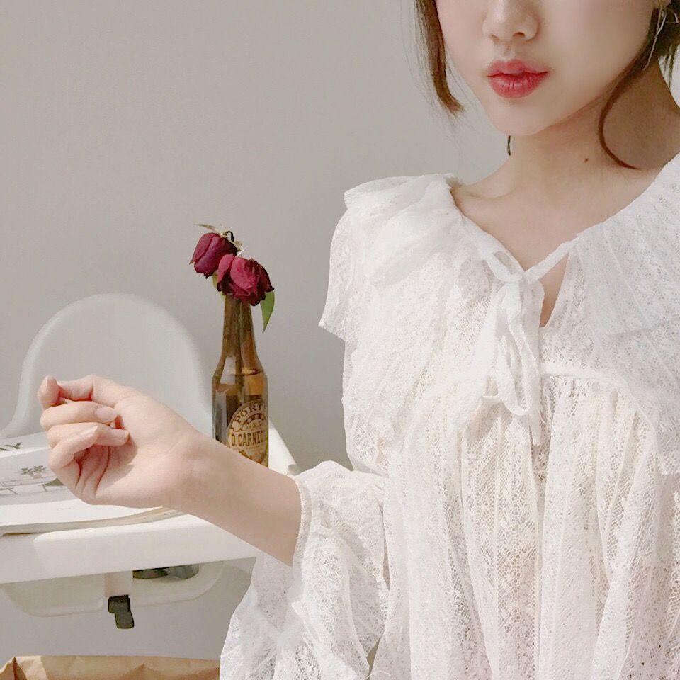 / 2018新款韓版港味復古chic純色娃娃領系帶長袖喇叭袖透視蕾絲上衣