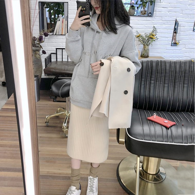 / 女神套裝秋冬新款2018流行毛呢外套加絨連帽衛衣高腰針織半身裙子