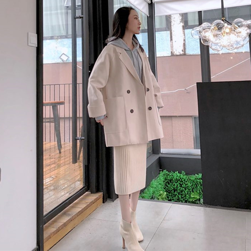 杏色外套|灰色衛衣|杏色裙子