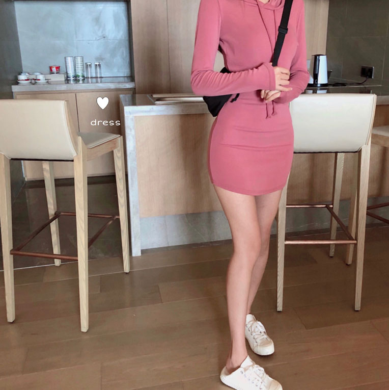 韓版時尚秋裝女2018新款裙子氣質連帽修身中長款連衣裙純色~2色潮