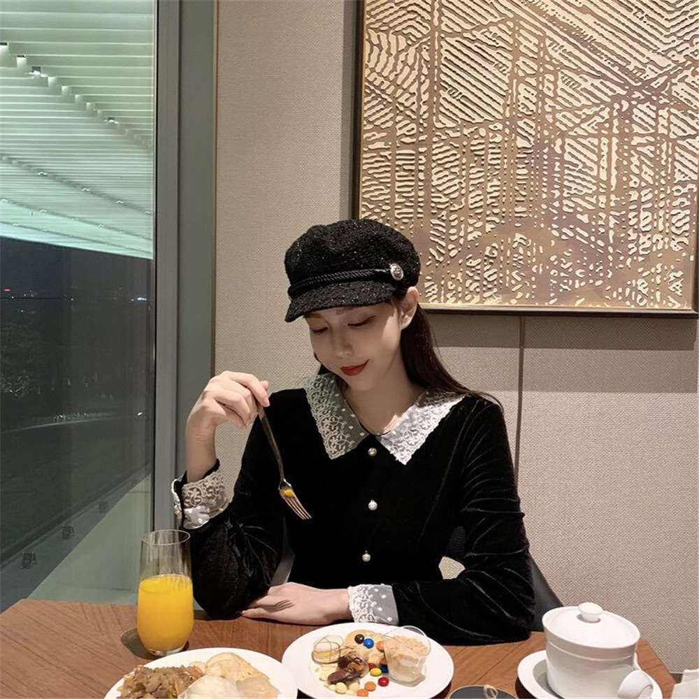 chic早秋裙子長裙女慵懶風韓版百搭娃娃領絲絨蕾絲顯瘦長袖連衣裙