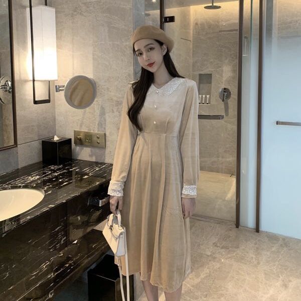 / chic早秋裙子長裙女慵懶風韓版百搭娃娃領絲絨蕾絲顯瘦長袖連衣裙
