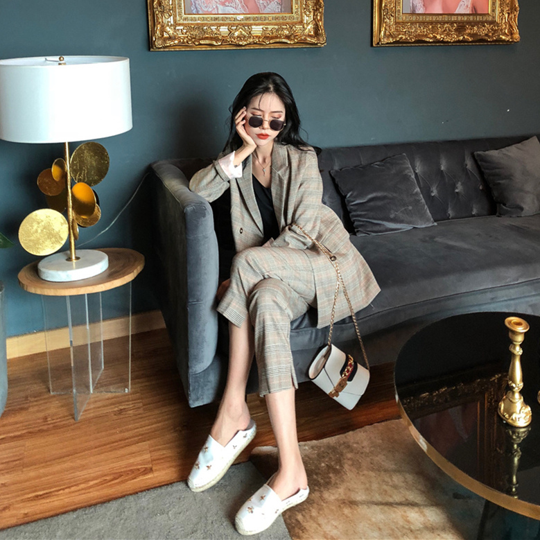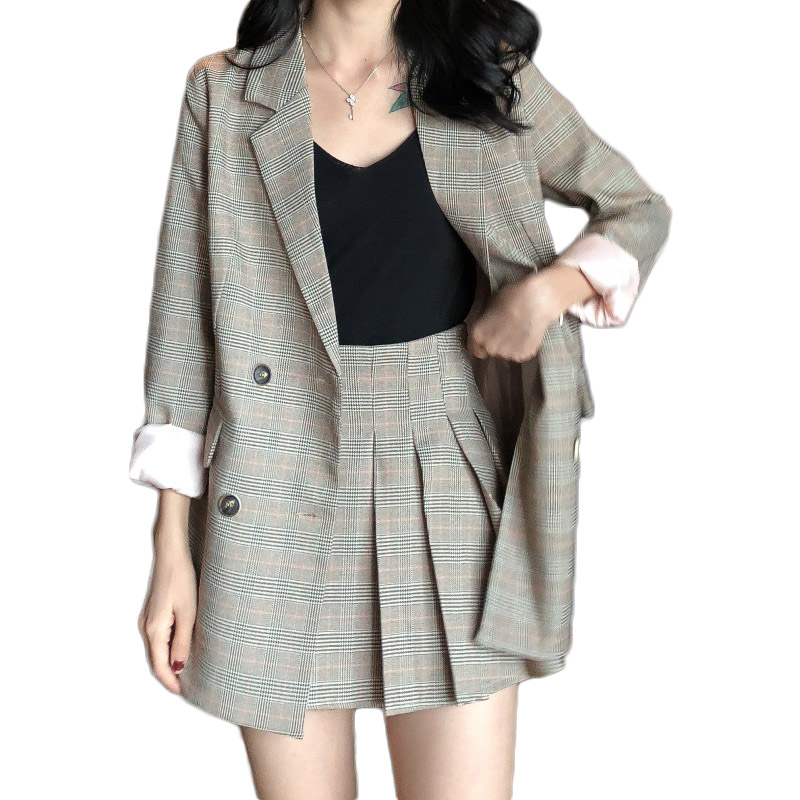 秋裝女2018新款格子西裝外套+高腰百褶半身裙+九分褲西褲三件套潮