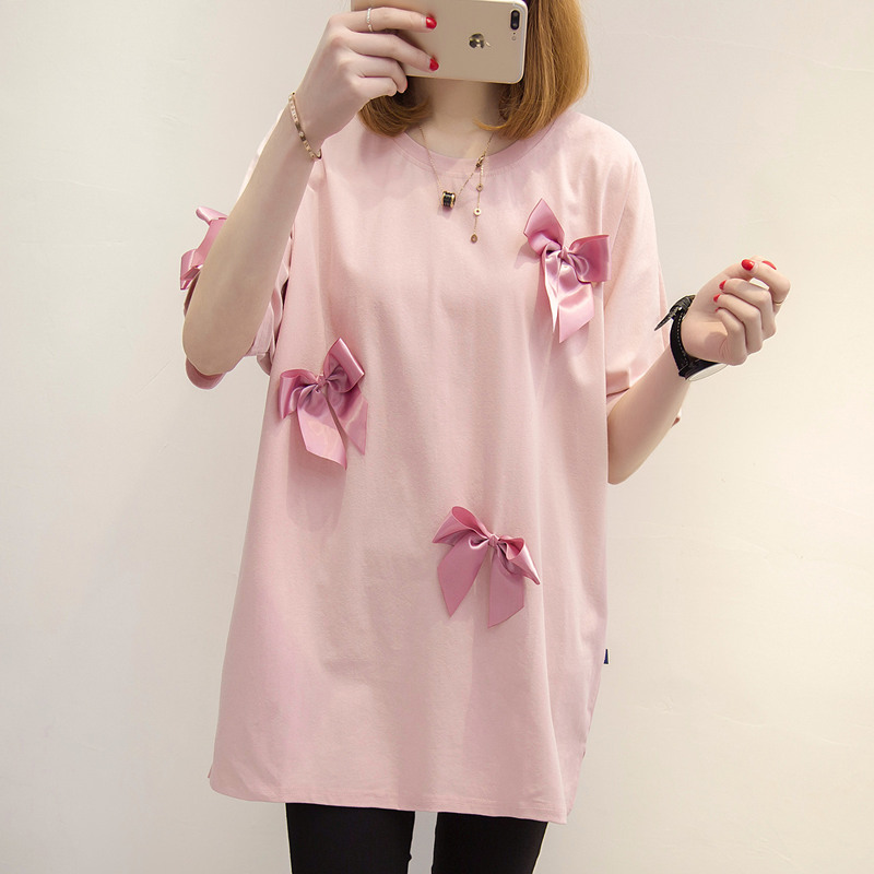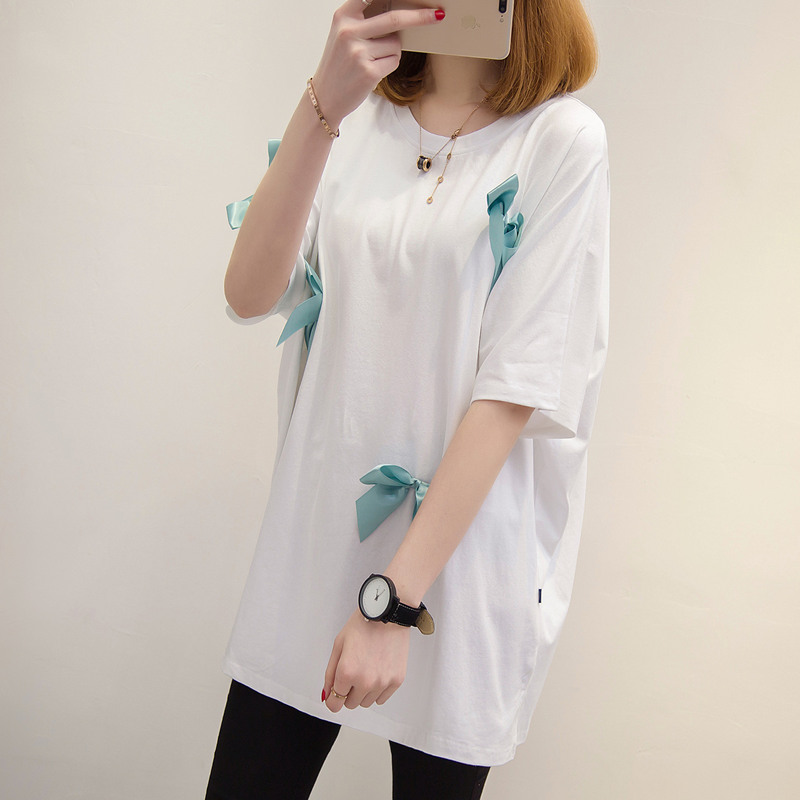 / 女裝夏裝新款潮白色t恤女半袖五分袖中長款韓版寬松百搭體恤