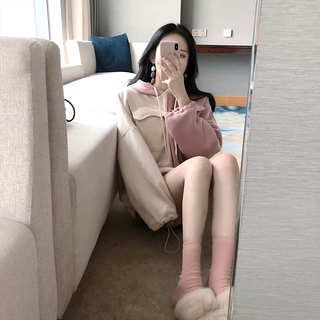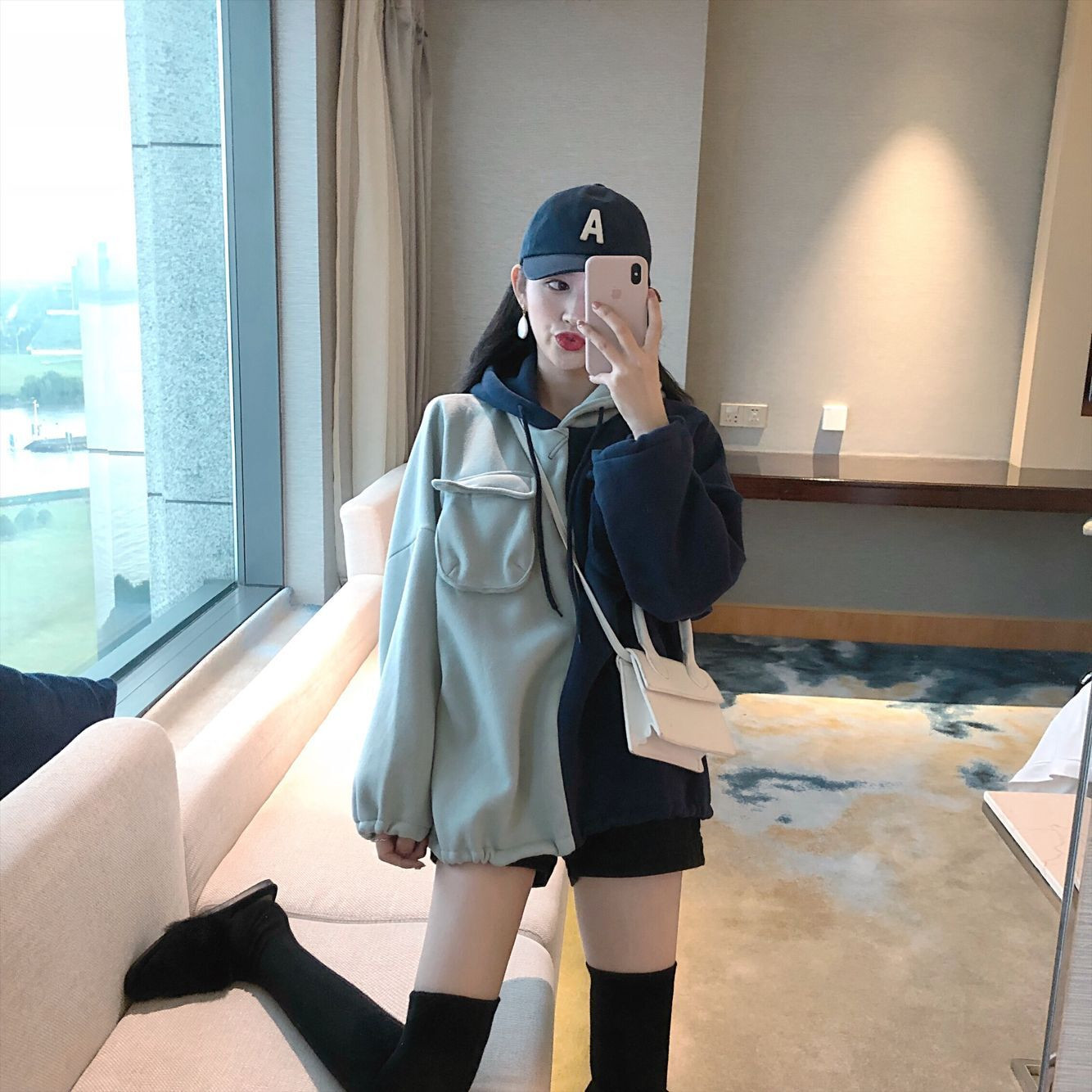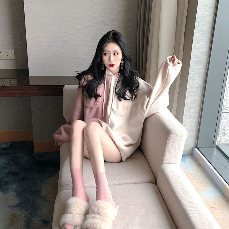 / 韓版時尚撞色拼接連帽衛衣女秋2018新款個性口袋加絨保暖抽繩上衣