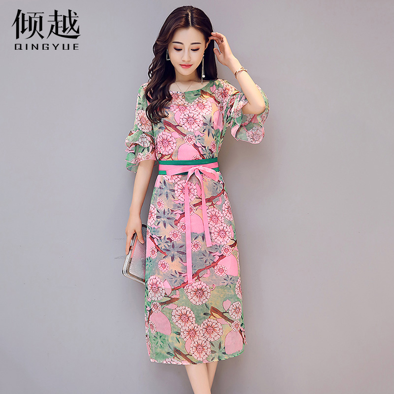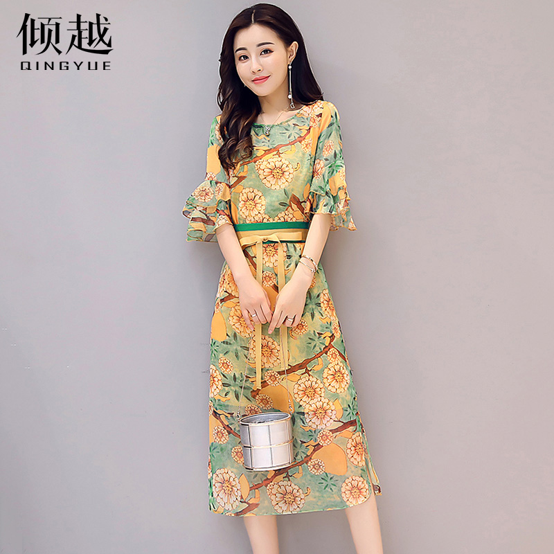 / 2017夏季新款復古印花短袖雪紡連衣裙時尚簡約氣質顯瘦開叉長裙子