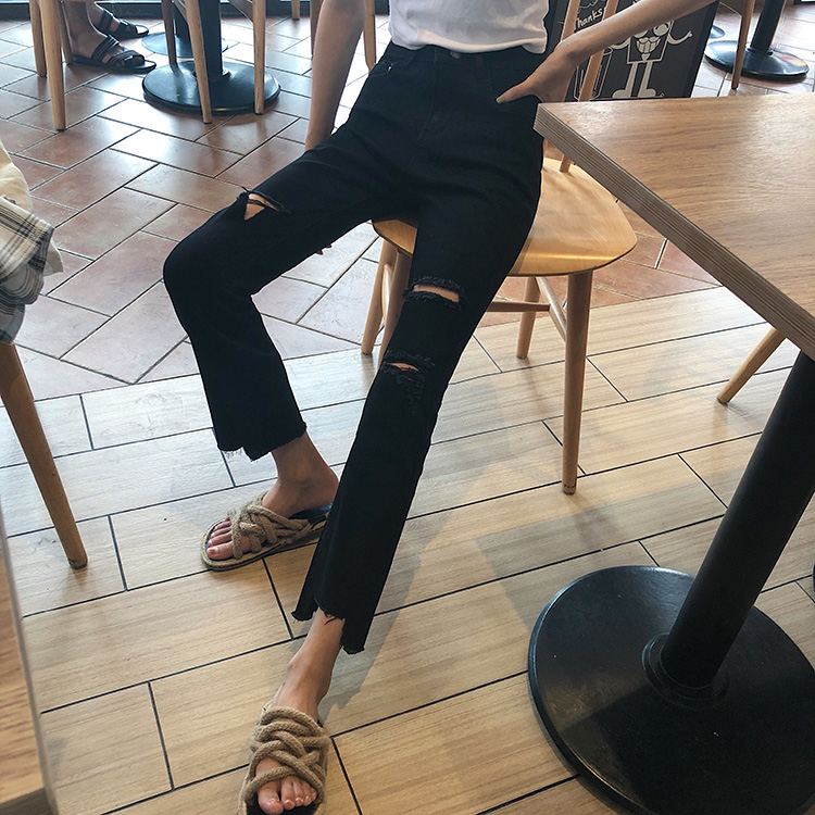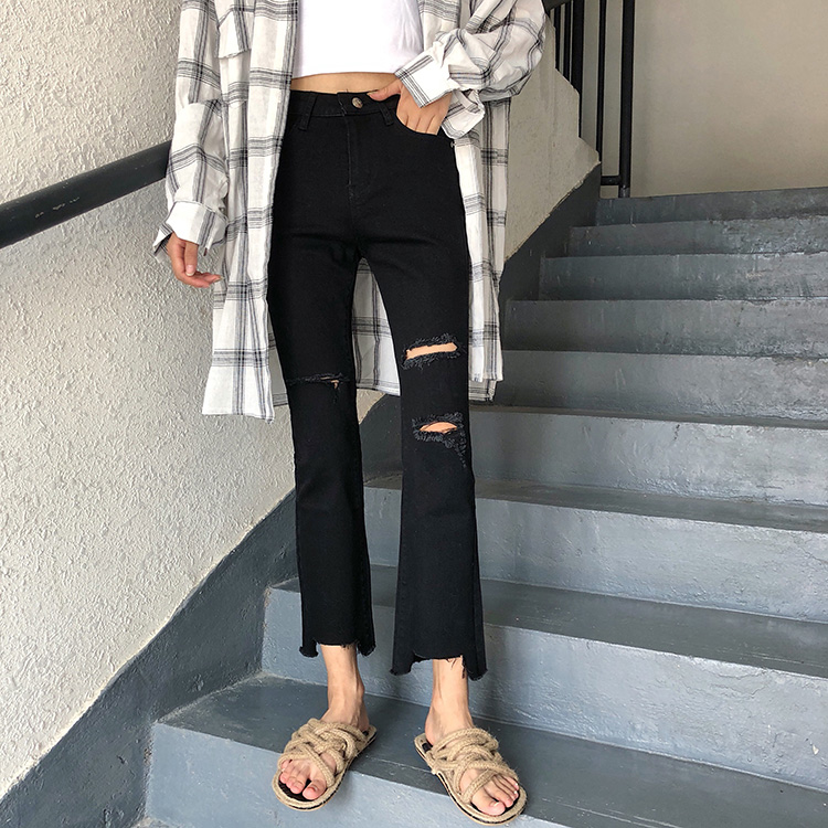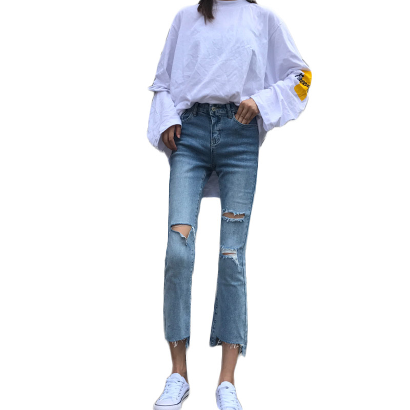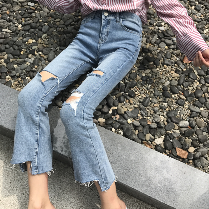 隨性破洞撕邊不規則彈力微喇牛仔褲女春秋2018新款韓版顯瘦九分褲