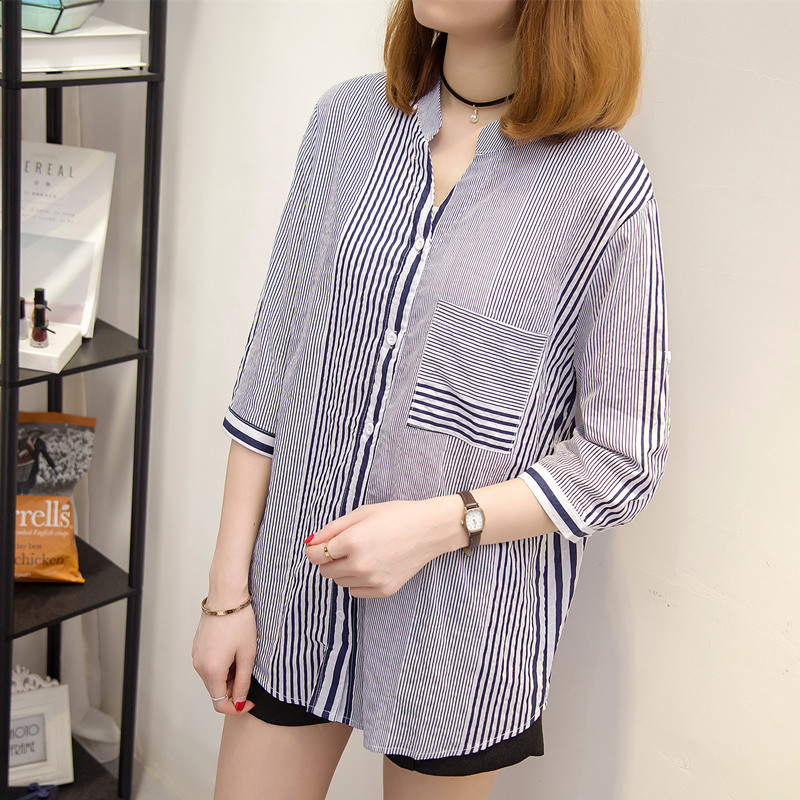 / 條紋襯衫女甜美上衣小清新韓范半袖不規則格子襯衣女chic襯衫外套