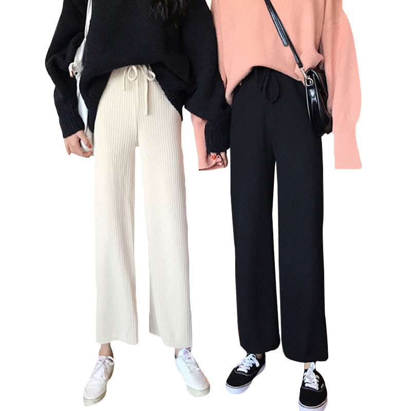 / 秋冬女裝韓版寬松百搭直筒褲高腰針織闊腿褲休閑褲九分褲學生褲子