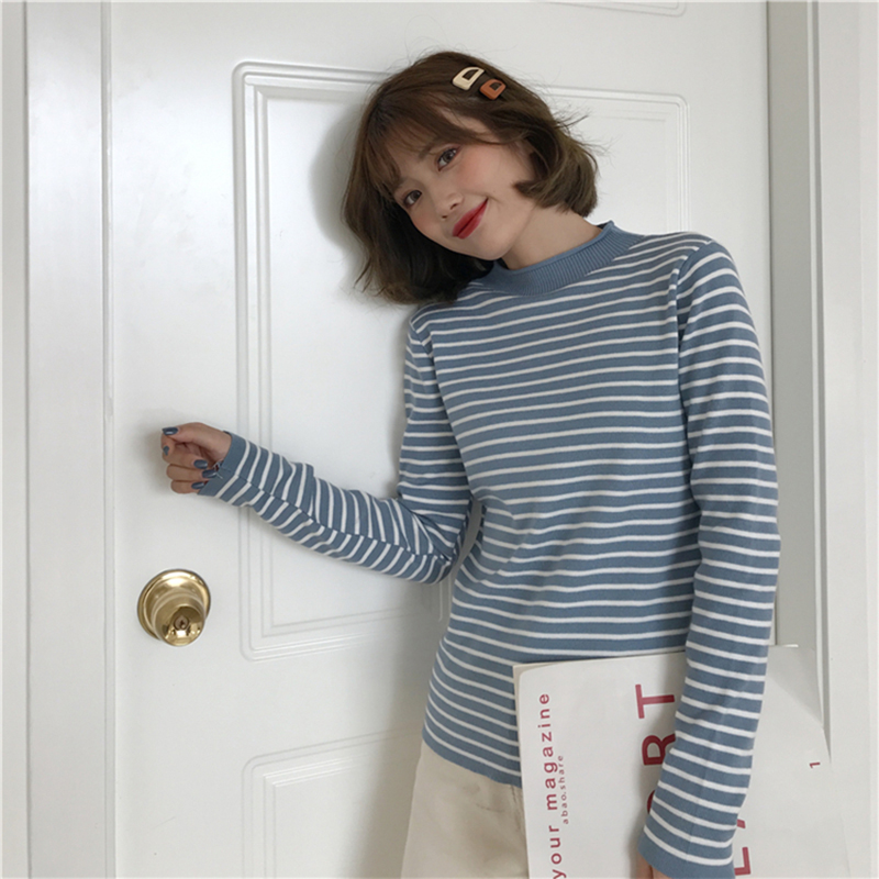半高領條紋長袖針織衫女秋冬裝2018新款韓版氣質修身外穿打底毛衣