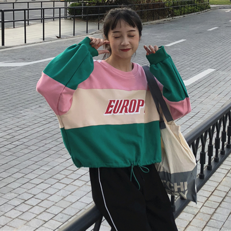/ 慵懶風拼色長袖字母套頭衛衣女秋裝新款學生寬松短款抽繩圓領上衣