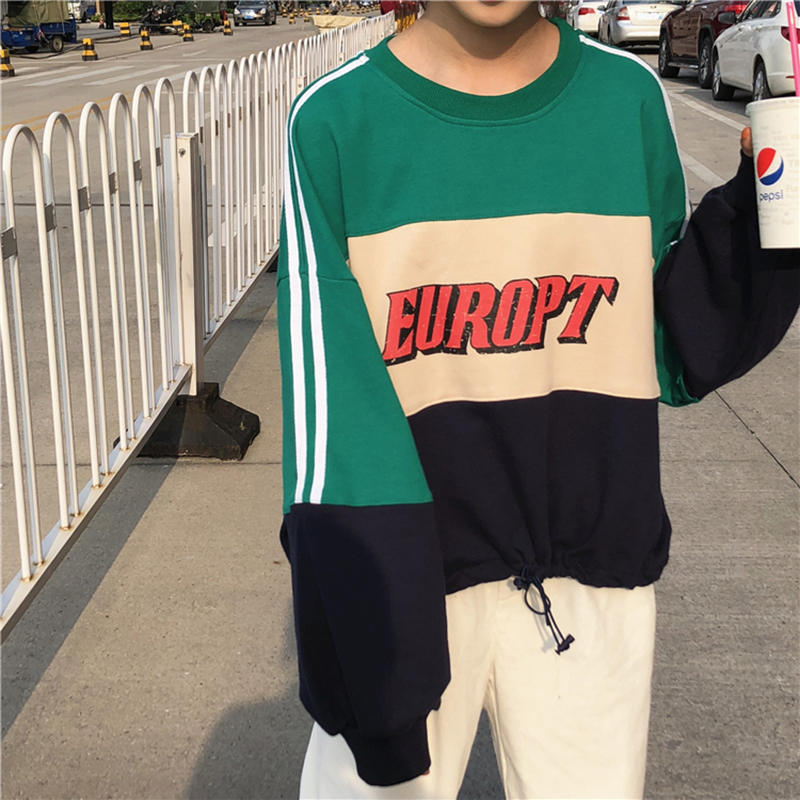 慵懶風拼色長袖字母套頭衛衣女秋裝新款學生寬松短款抽繩圓領上衣