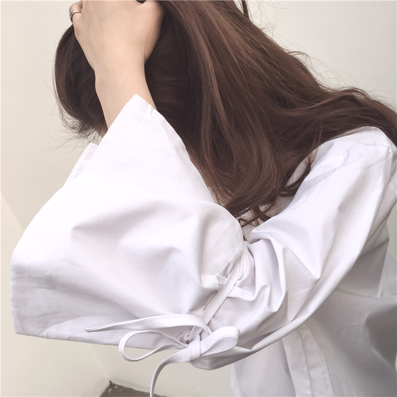 / ulzzang學院風百搭寬松V領前短后長系帶襯衫燈籠喇叭袖白色襯衣女