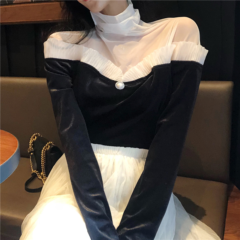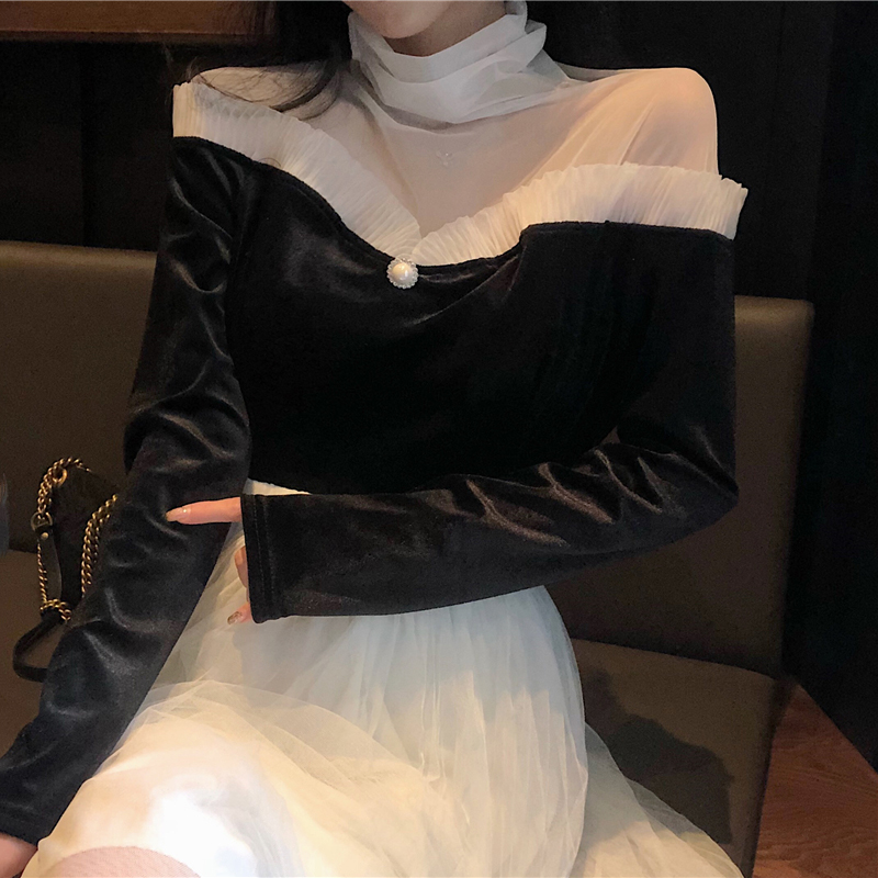 chic金絲絨高領長袖打底衫女秋冬裝2018新款修身百搭拼接蕾絲上衣