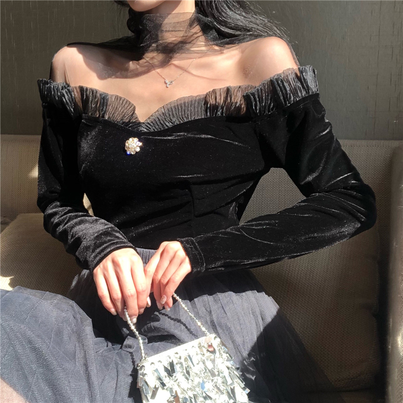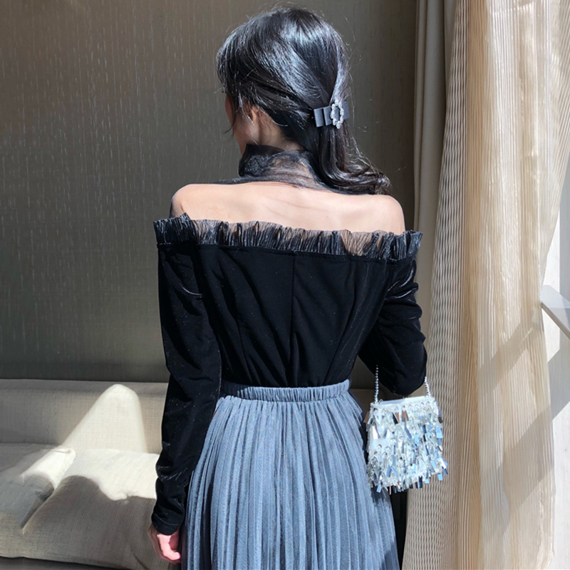 / chic金絲絨高領長袖打底衫女秋冬裝2018新款修身百搭拼接蕾絲上衣