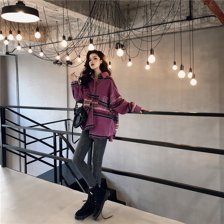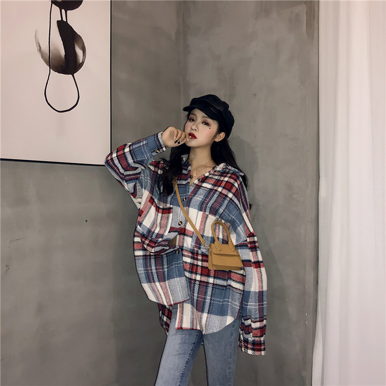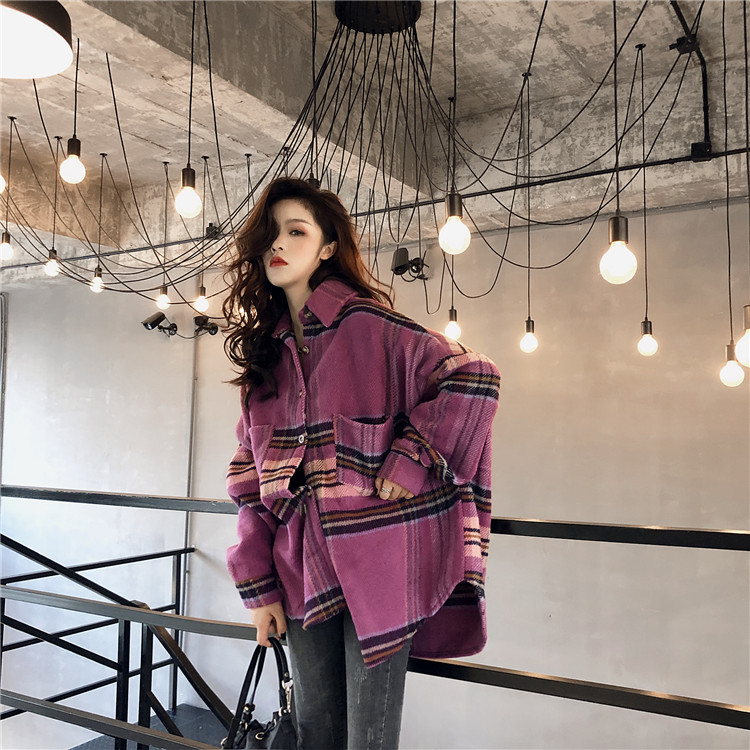 / 港風顯瘦oversize新款韓版寬松氣質慵懶格子泡泡袖毛呢襯衫外套女