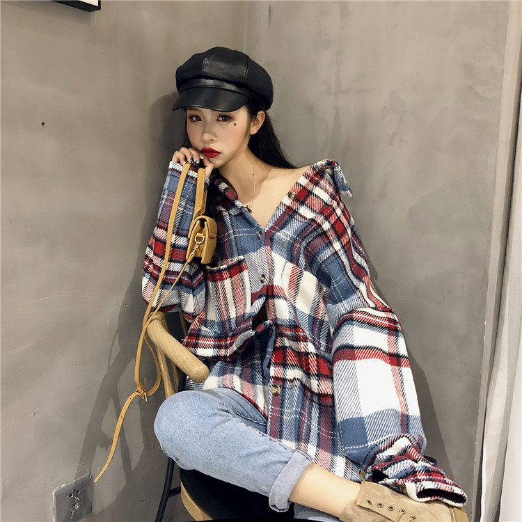 港風顯瘦oversize新款韓版寬松氣質慵懶格子泡泡袖毛呢襯衫外套女