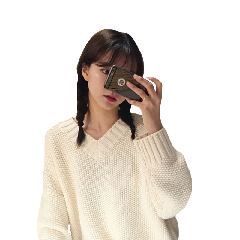 / 秋季女裝韓版學院風V領套頭毛衣寬松純色復古加厚長袖針織衫上衣