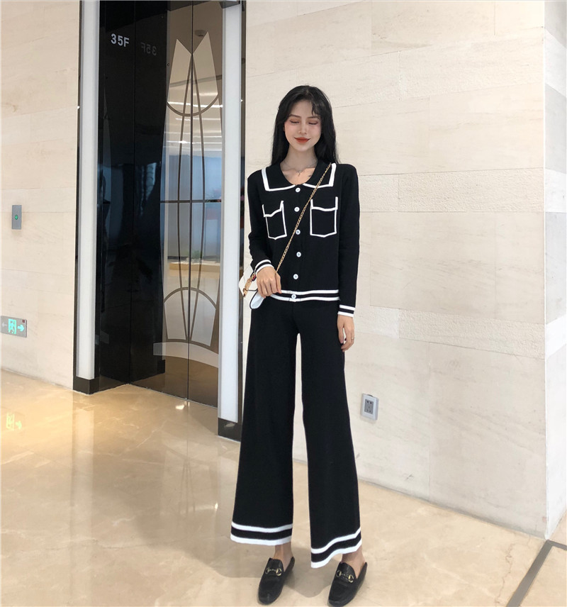 韓范女神套裝秋冬季新款針織顯瘦小香風短款上衣+闊腿長褲兩件套