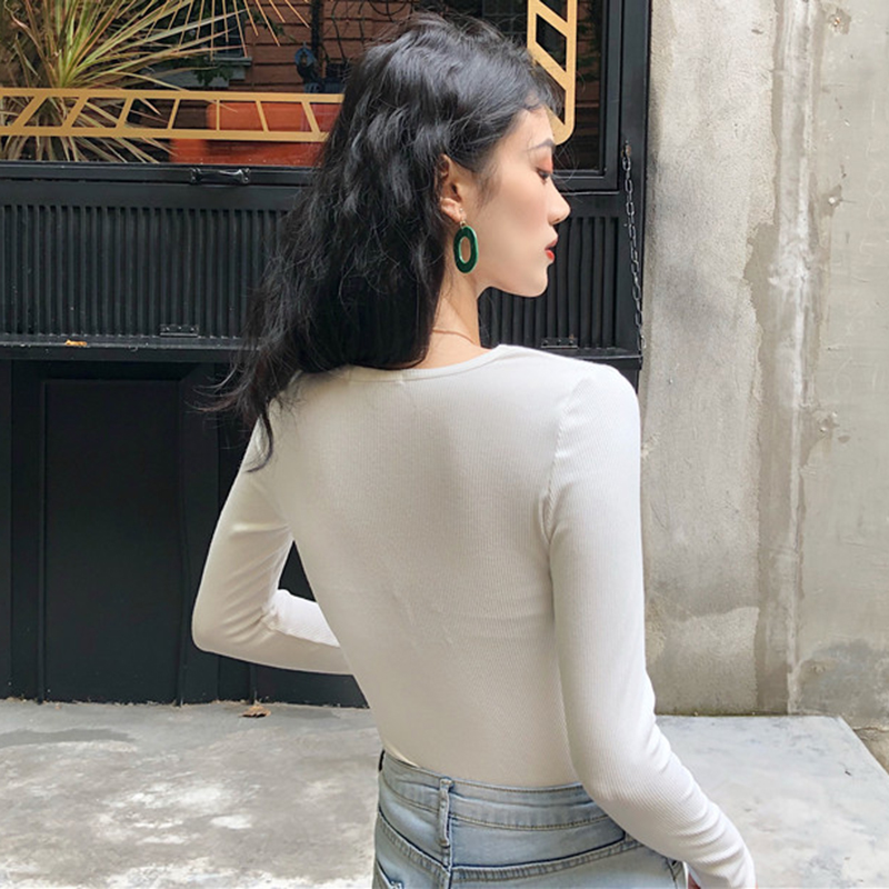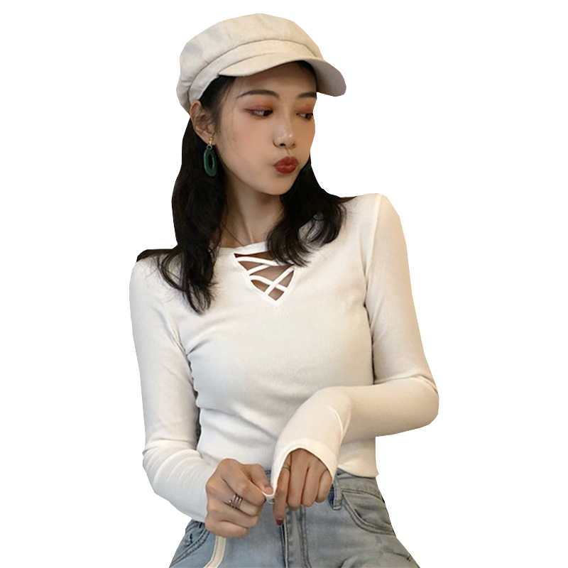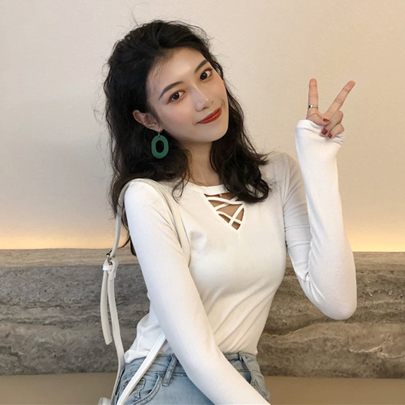 / 女裝韓版港味心機V領長袖交叉鏤空t恤上衣秋裝新款修身顯瘦打底衫