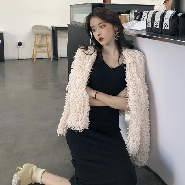 / 港味時尚套裝毛毛開衫外套+吊帶針織連衣裙女秋冬2018新款兩件套