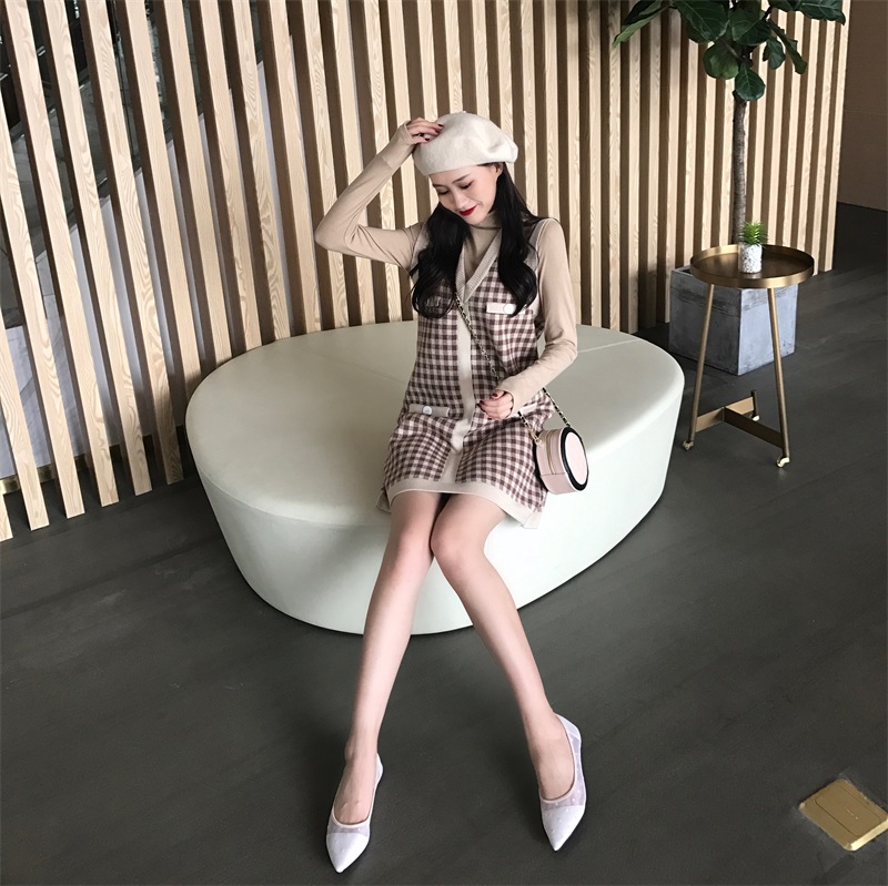 / 秋裝女2018新款套裝小香風千鳥格針織馬甲連衣裙+高領螺紋打底衫