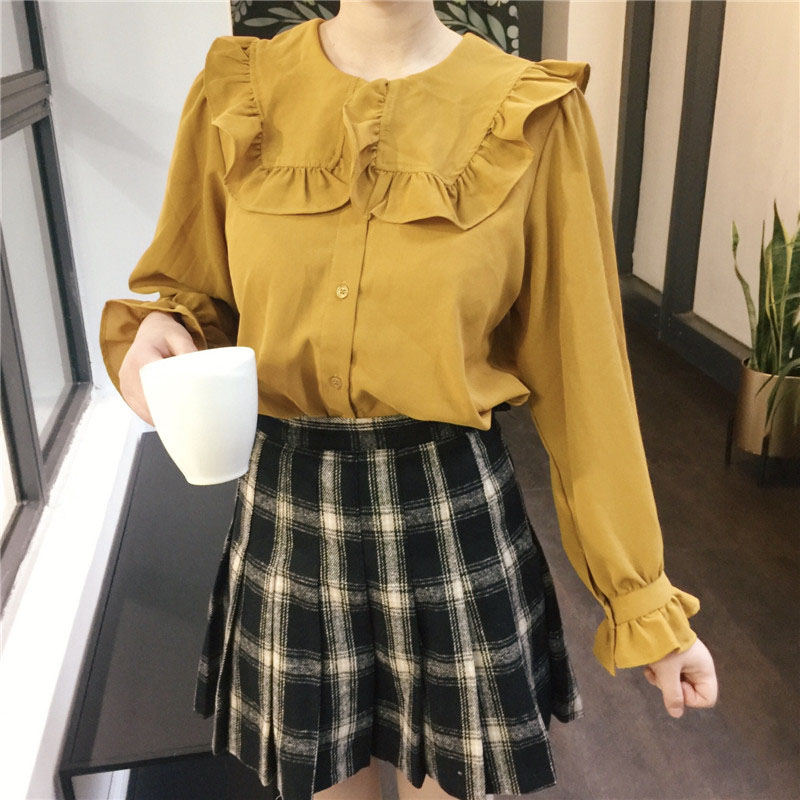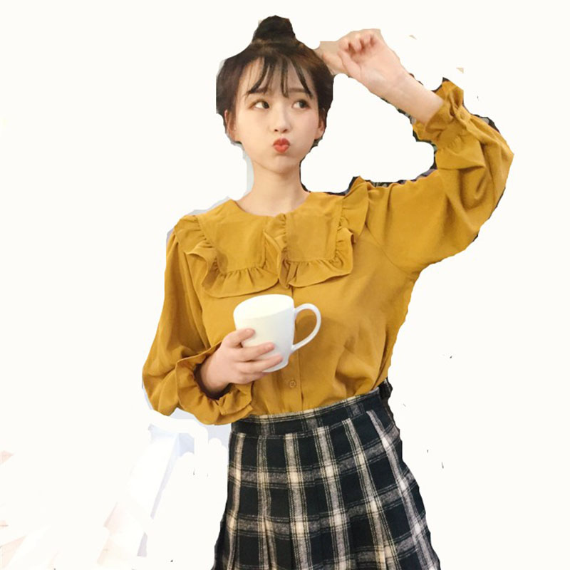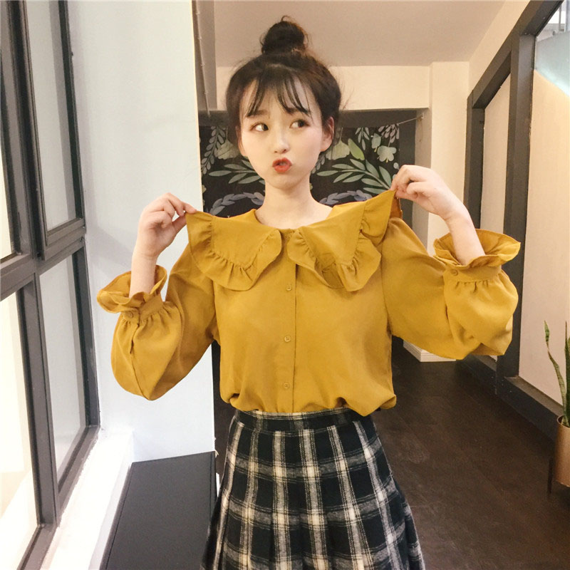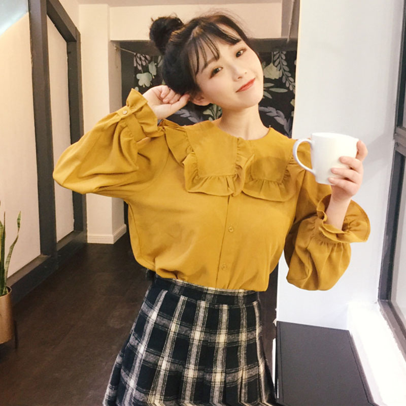 / 韓版2018秋裝新款純色荷葉邊可愛娃娃上衣少女寬松單排扣長袖襯衫