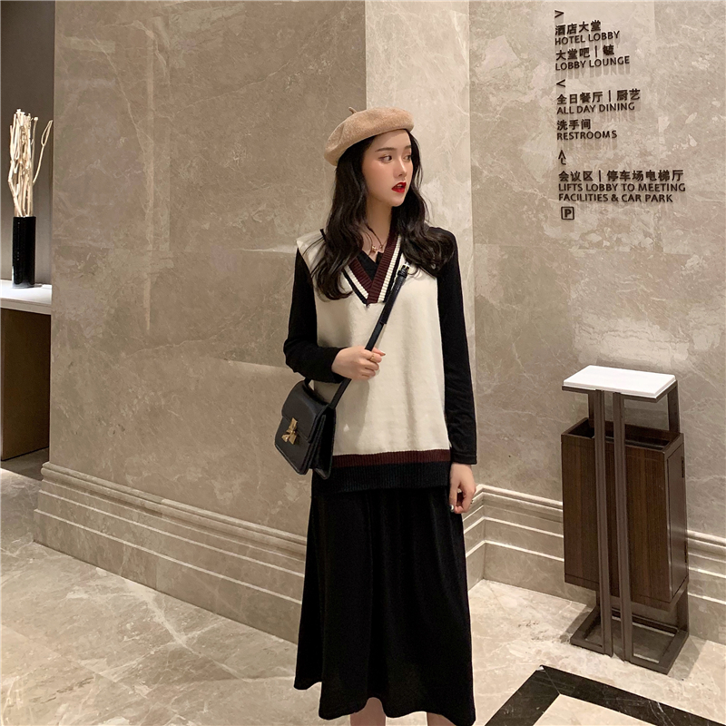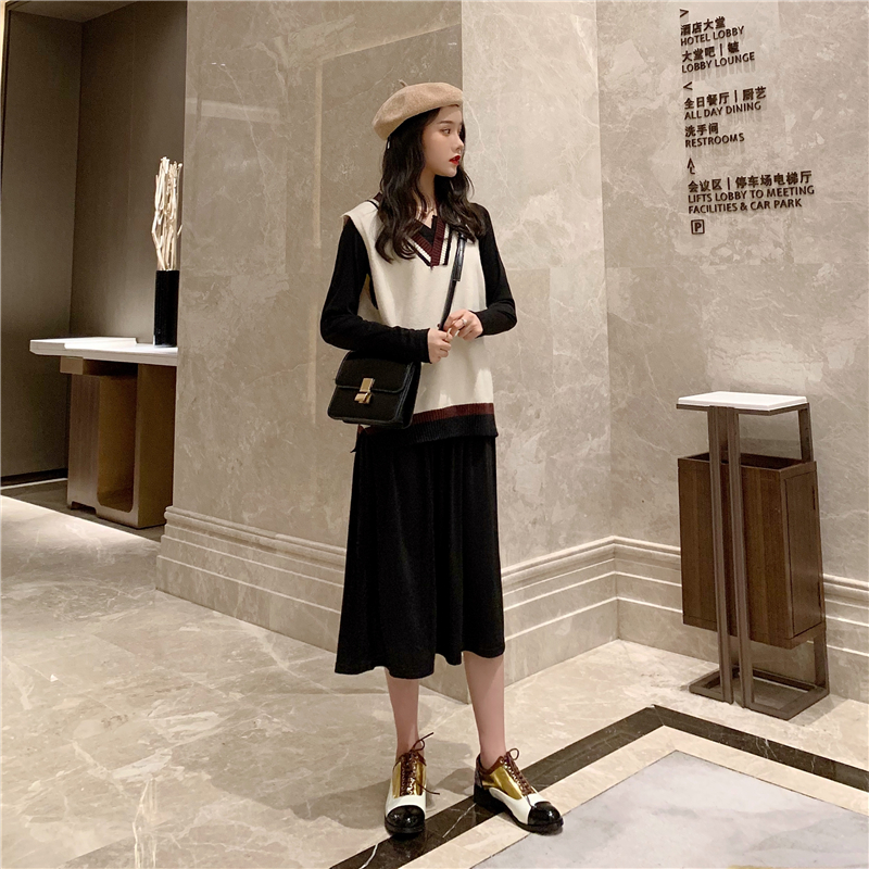 秋裝女2018新款網紅氣質女神毛衣針織馬甲+長款黑色打底連衣裙女