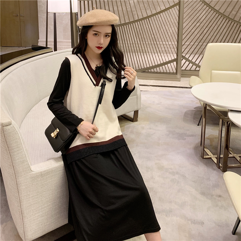 韓版秋裝女2018新款套裝V領針織馬甲女+慵懶打底高領連衣裙兩件套