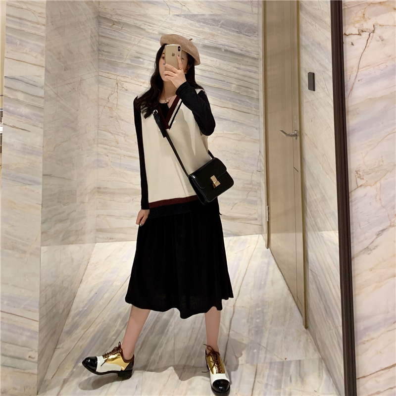 / 秋裝女2018新款網紅氣質女神毛衣針織馬甲+長款黑色打底連衣裙女