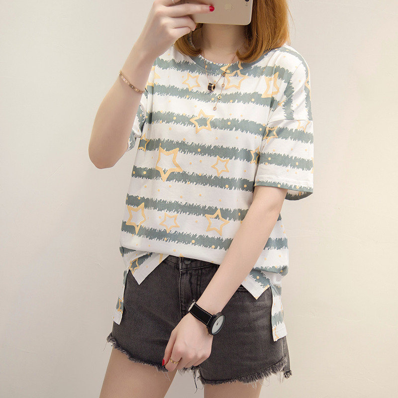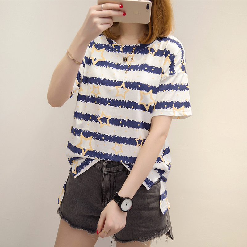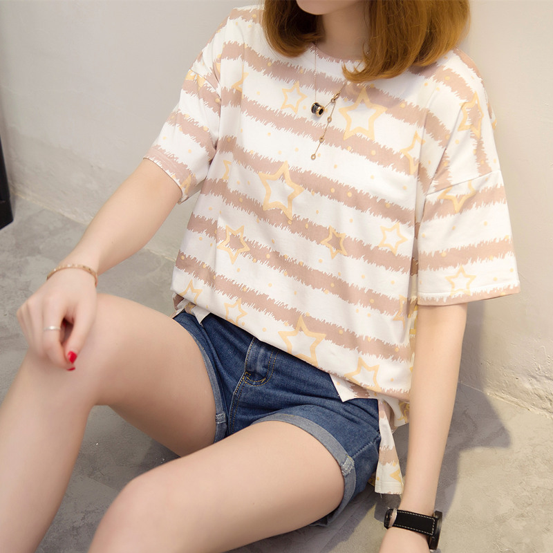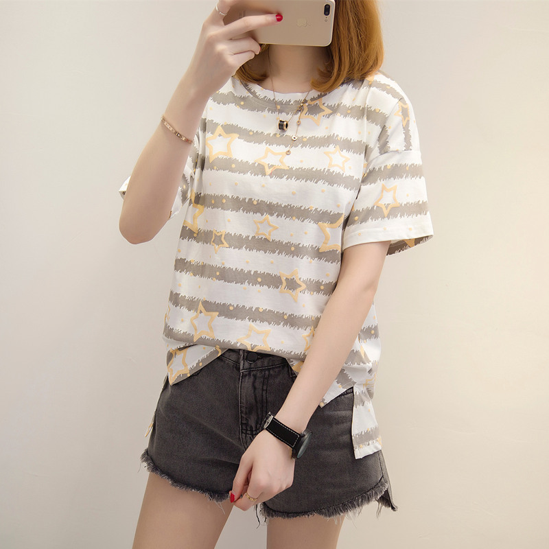夏裝新款短袖女條紋寬松T恤女五角星體恤衫百搭上衣服女夏潮