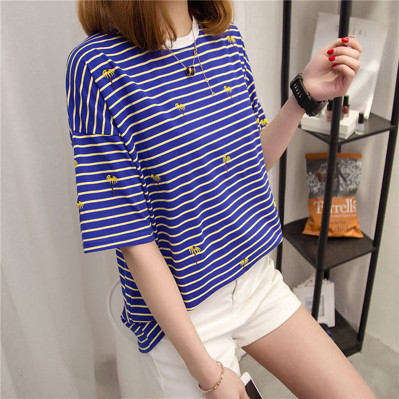 / 夏裝新款女裝條紋寬松t恤女中長袖韓版學生上衣女打底體恤衫