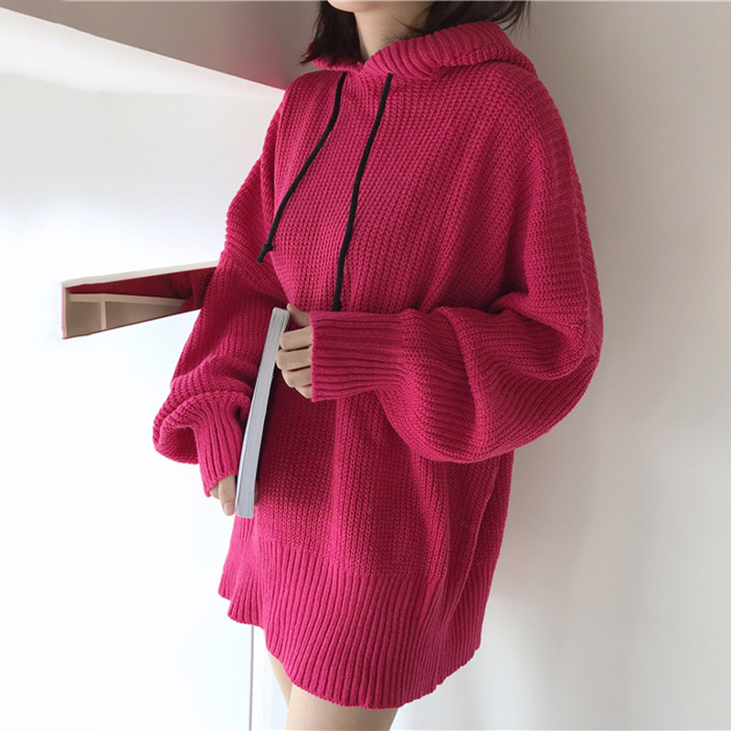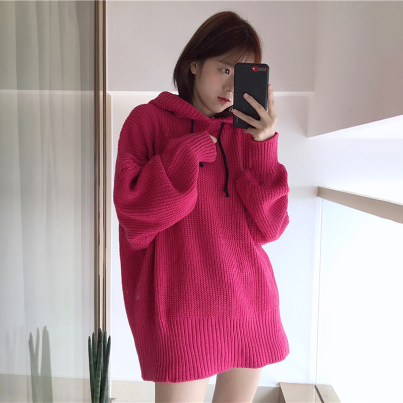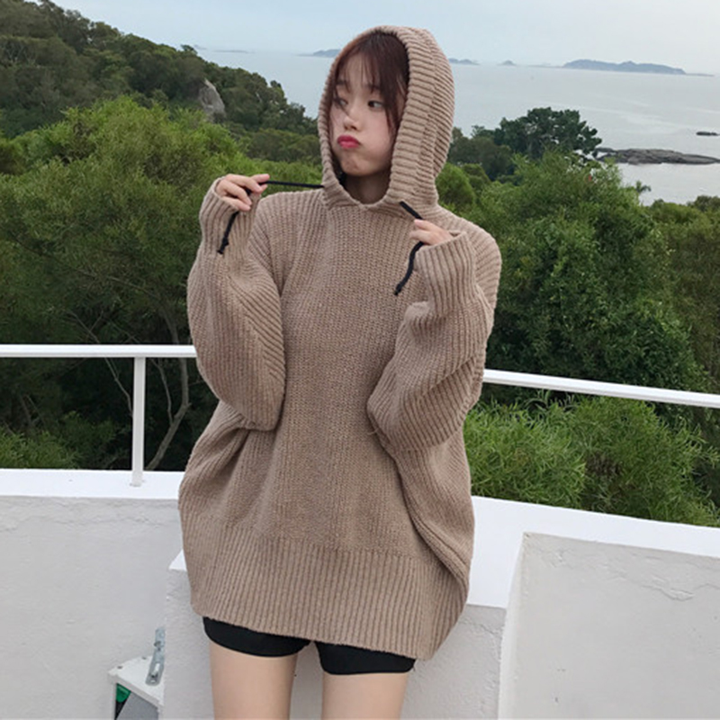 慵懶風毛衣外套女秋冬新款女裝韓版寬松中長款連帽粗毛線針織上衣