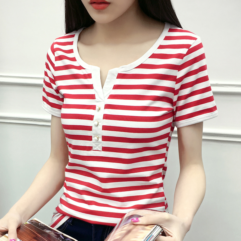 春夏新款大碼顯瘦條紋短袖t恤女打底衫上衣半袖體恤衫