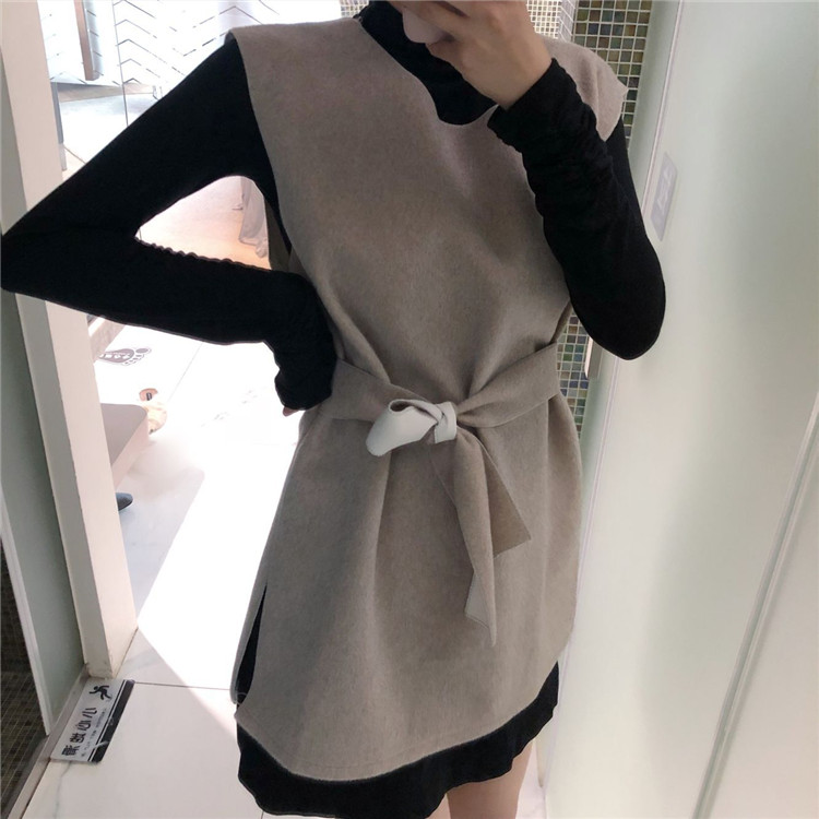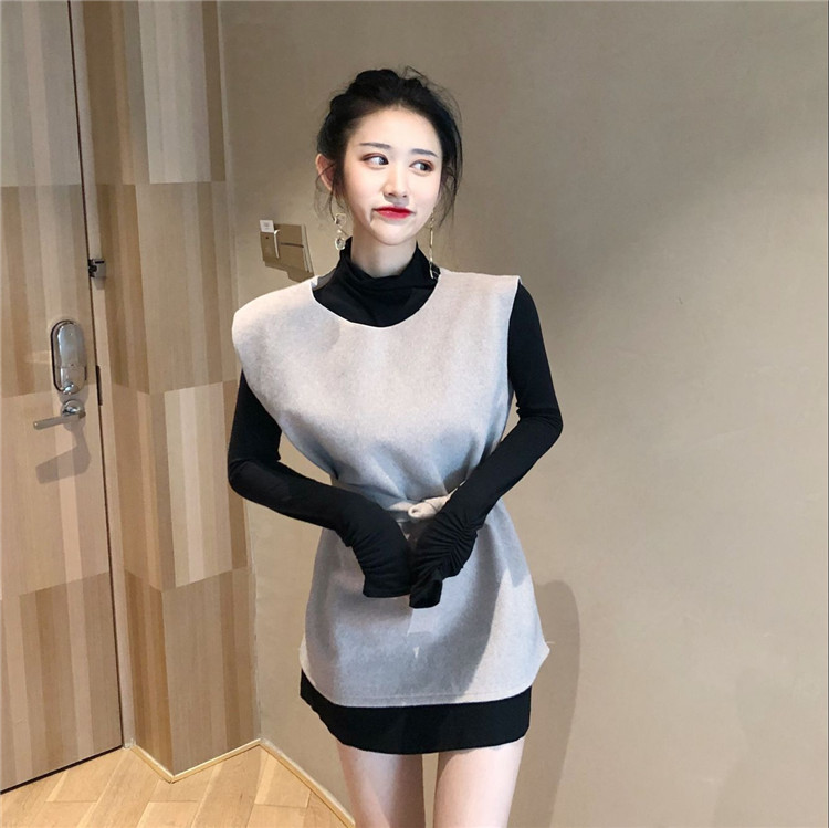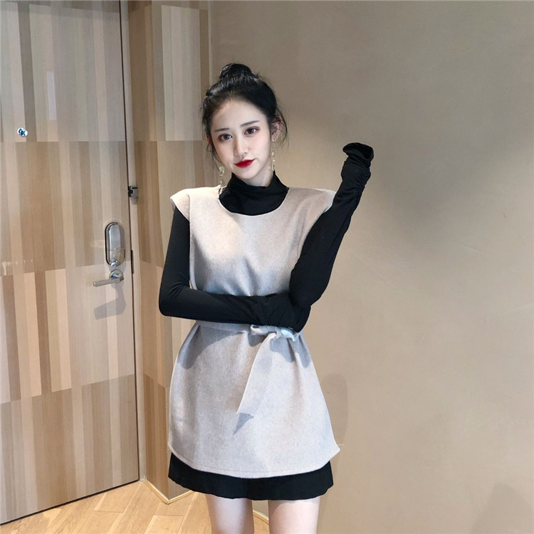 / 2018秋裝新款韓版chic時尚兩件套百搭高領打底衫系帶無袖背心套裝