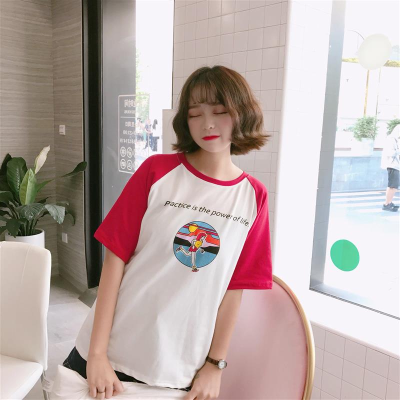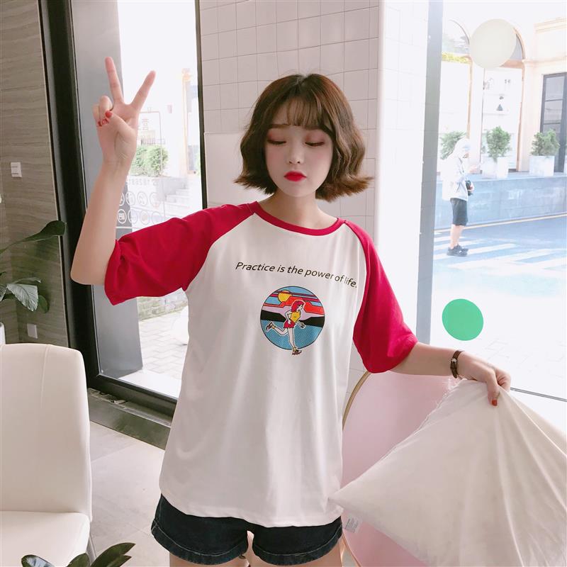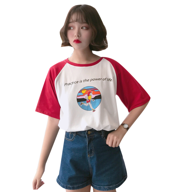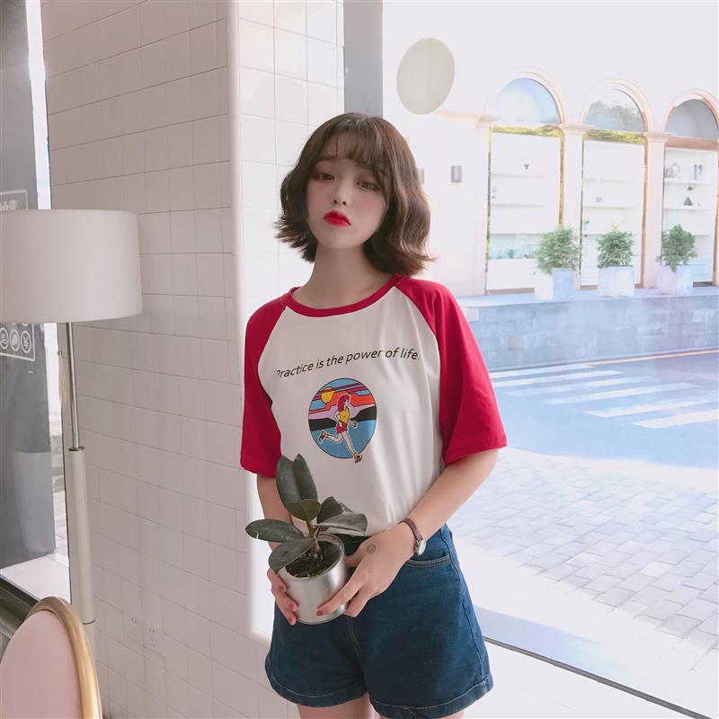 / 夏裝女裝韓版學院風拼色字母寬松短袖T恤百搭學生插肩袖中袖上衣