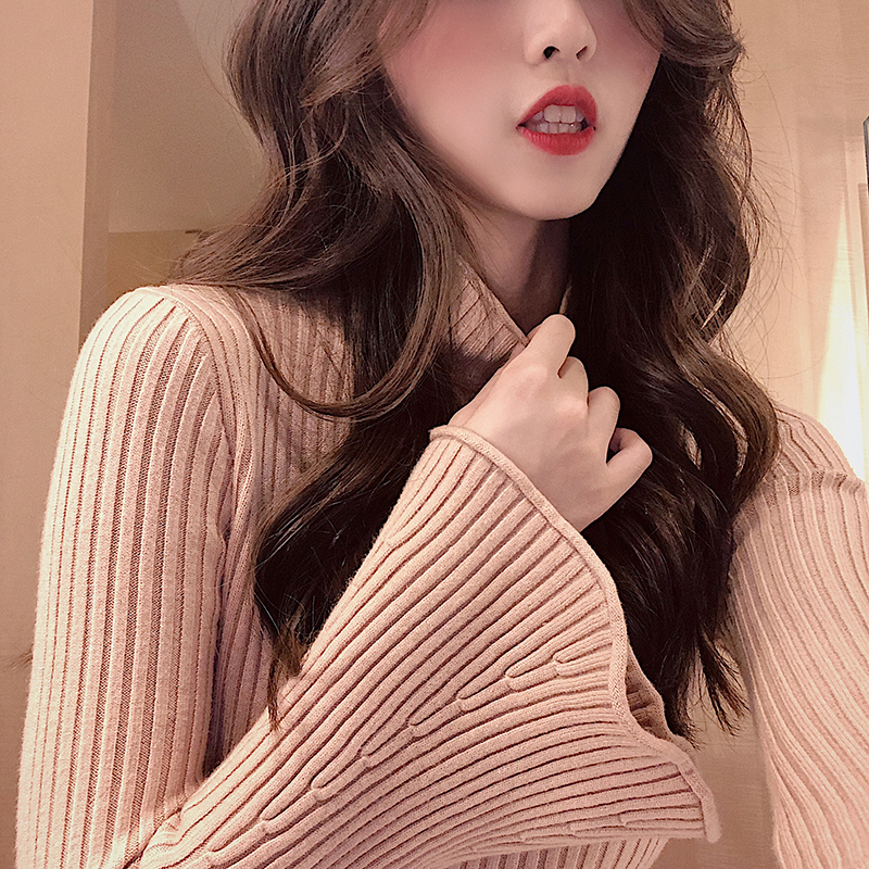 / 韓國chic風簡約純色坑條針織衫女2018新款半高領長袖打底衫上衣傳