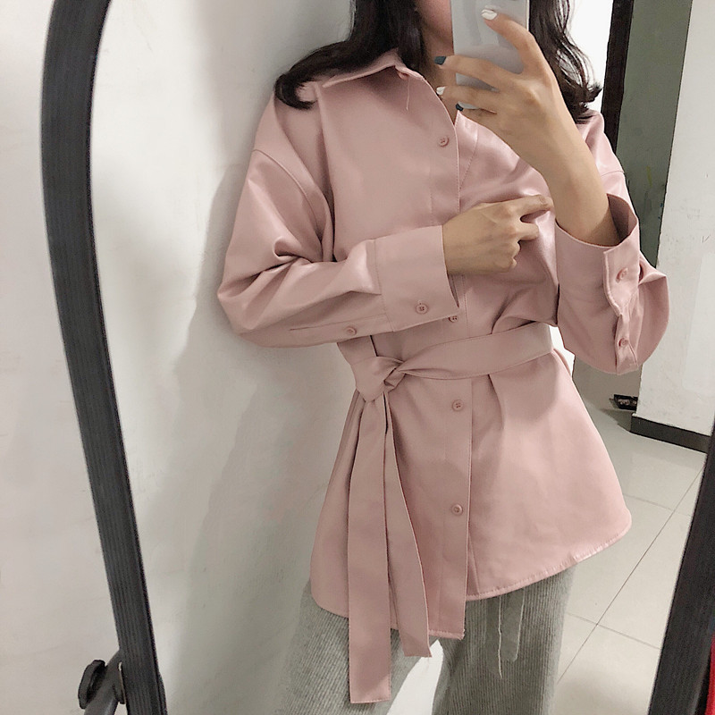 / 2018新款韓版chic秋款單排扣襯衣柔軟pu小皮衣寬松系帶腰短外套女